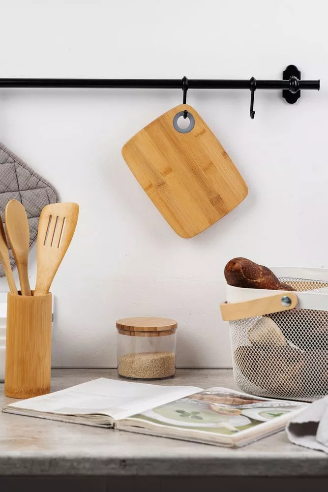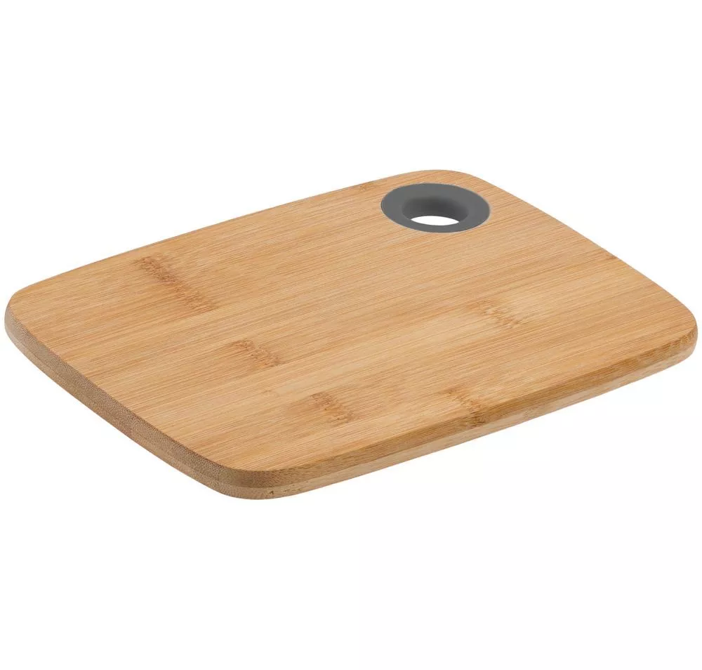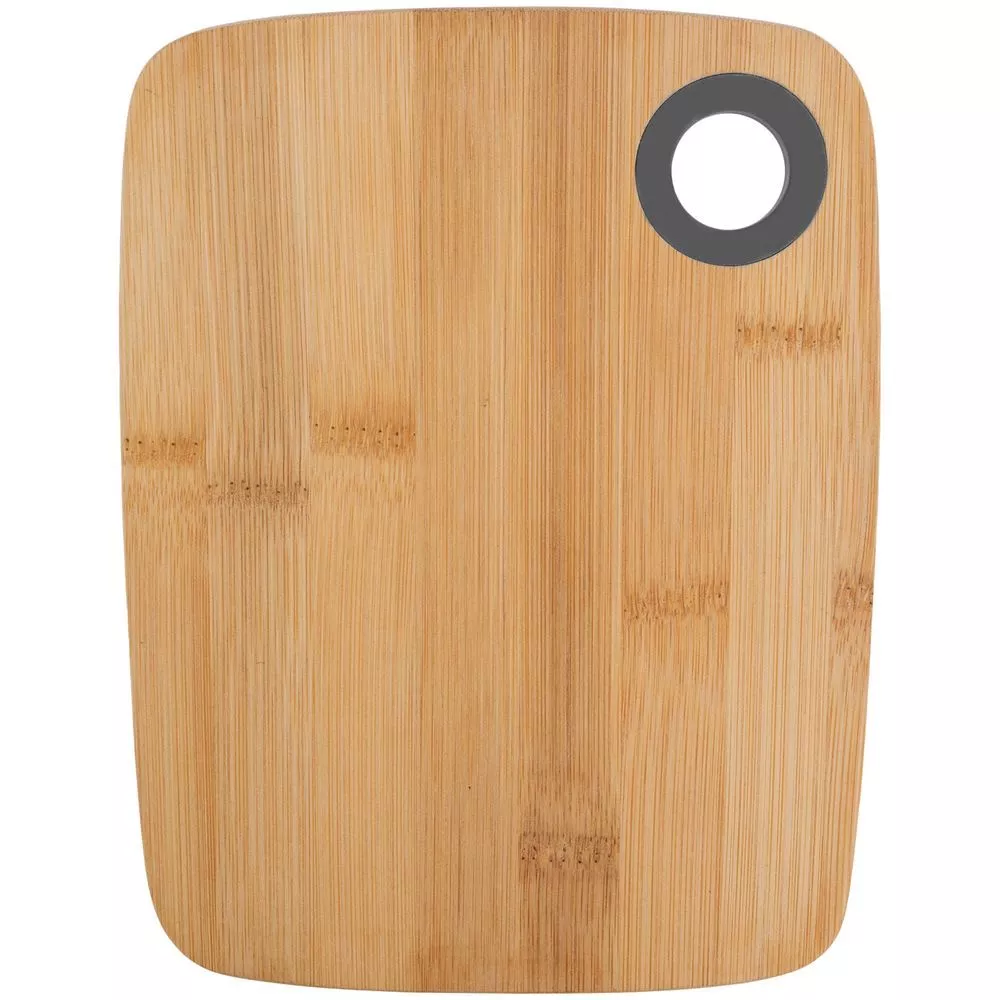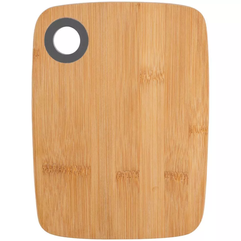 Бамбук обладает высокой прочностью и антимикробными свойствами. Доска не скользит по поверхности стола, легко моется после использования. Для удобства размещения на стене предусмотрено отверстие в верхнем углу.