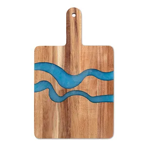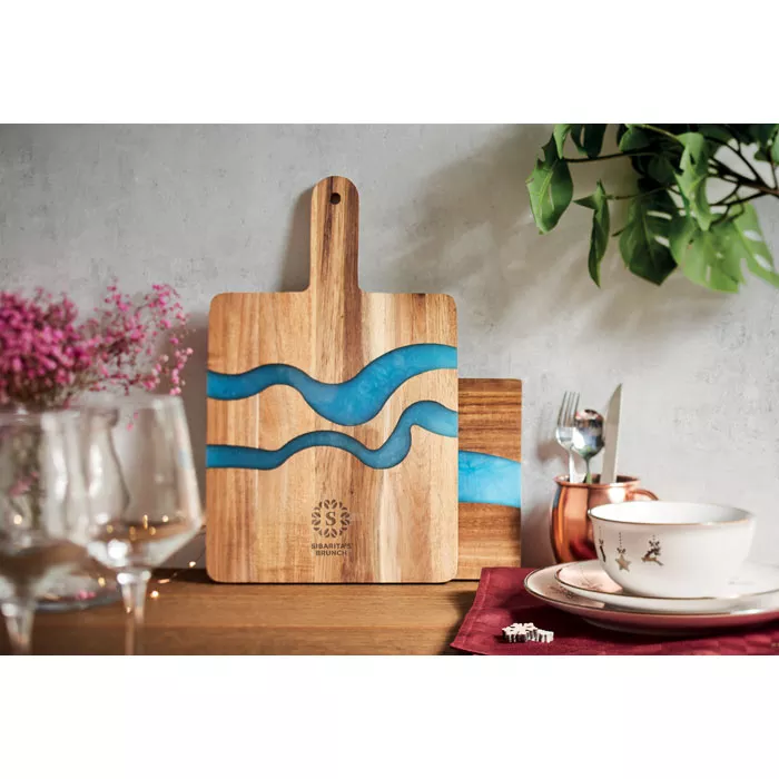 Сервировочная доска из древесины акации с украшением из эпоксидной смолы и ручкой.