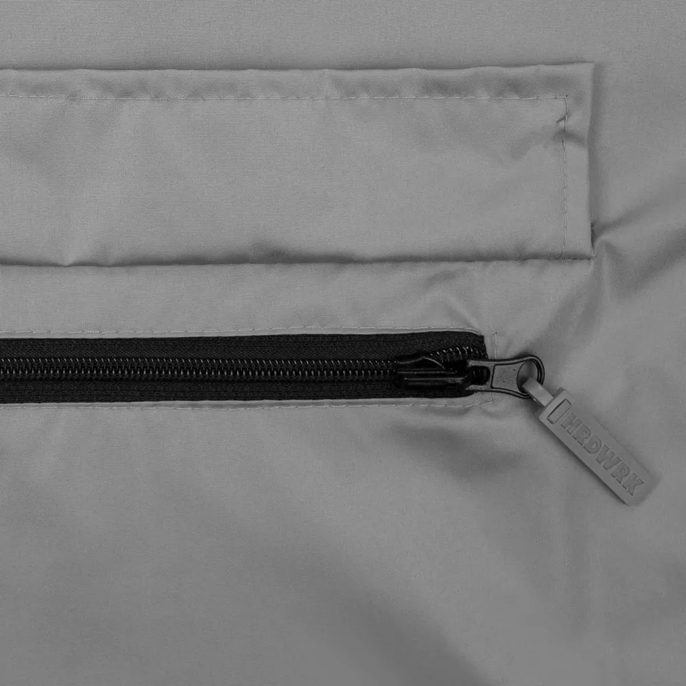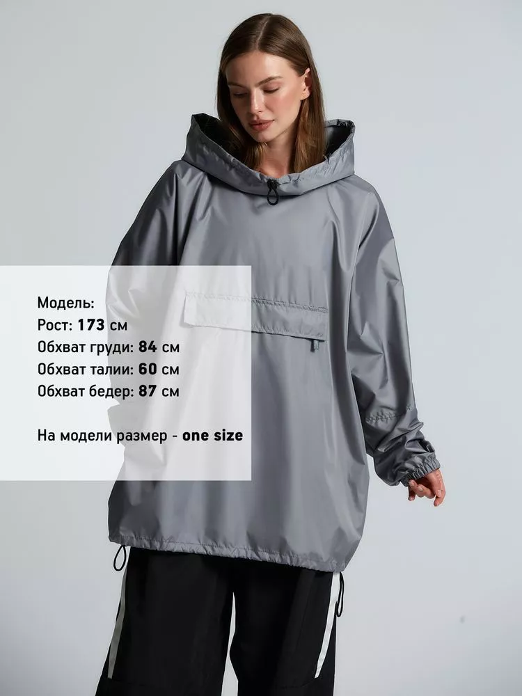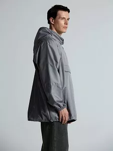 Дождевик-анорак с капюшоном и карманом на молнии спереди. Выполнен из ткани дюспо с матовой поверхностью — легкой, мягкой на ощупь, но устойчивой к повреждениям. Она не шелестит и практически не мнется. Благодаря пропитке дюспо обладает отличными водоотталкивающими и ветрозащитными свойствами.