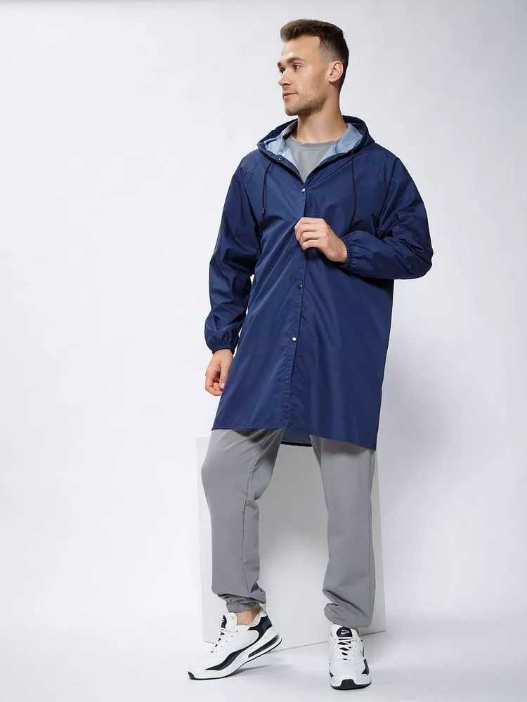Легкий городской дождевик классической модели на кнопках с регулируемым капюшоном из влагоустойчивого материала подходит для защиты в непогоду, компактно упаковывается в чехол.