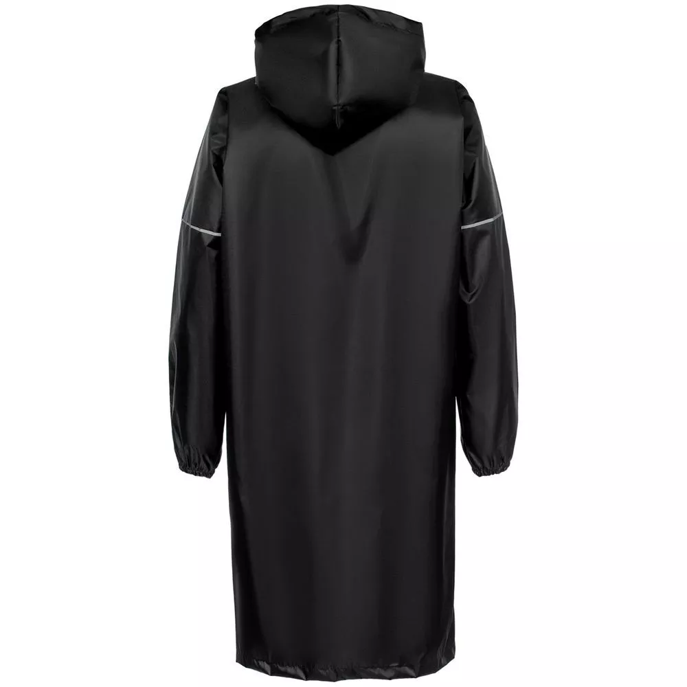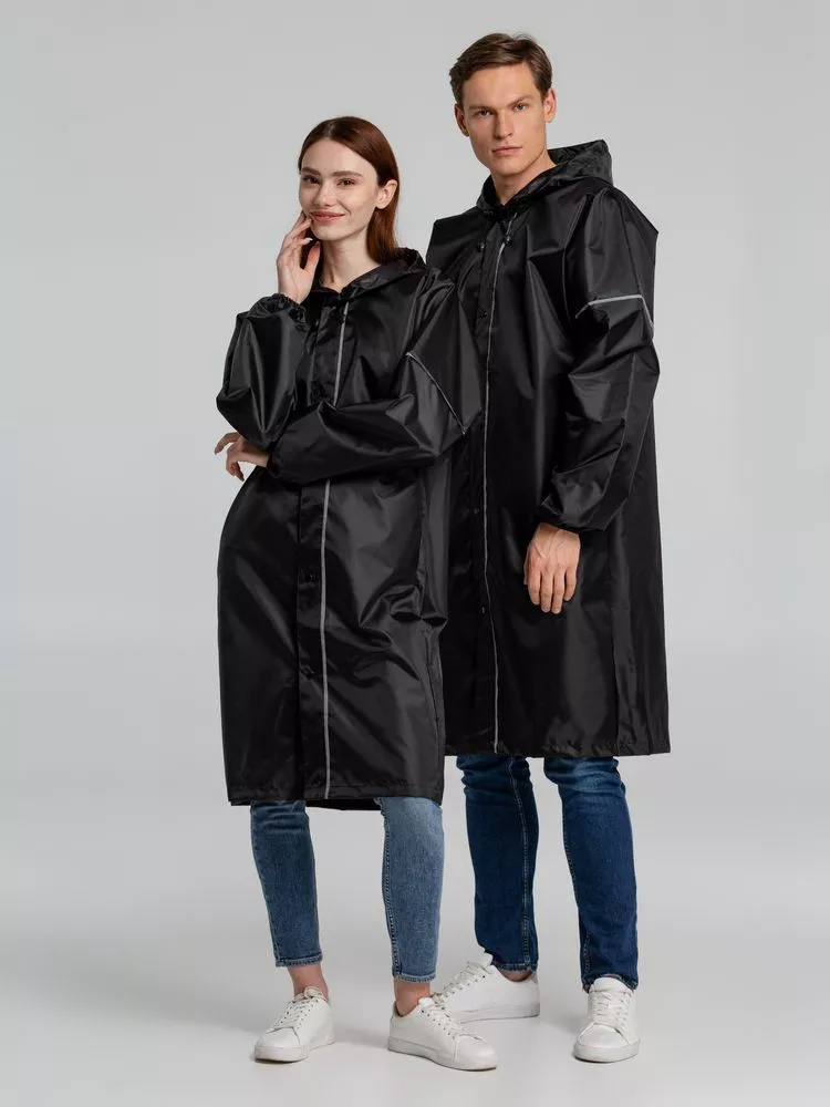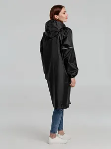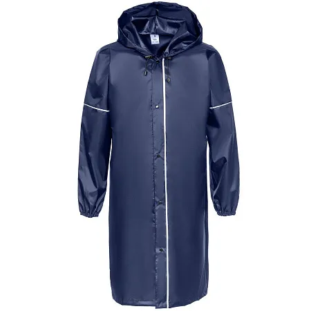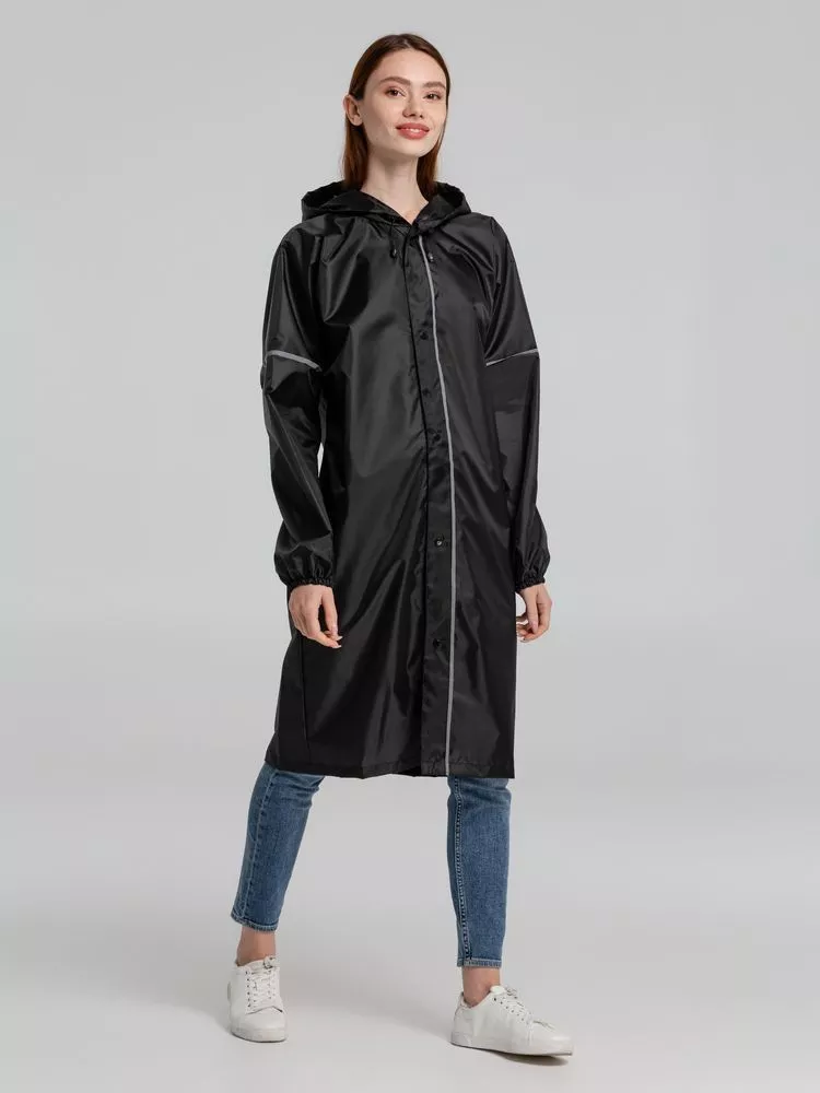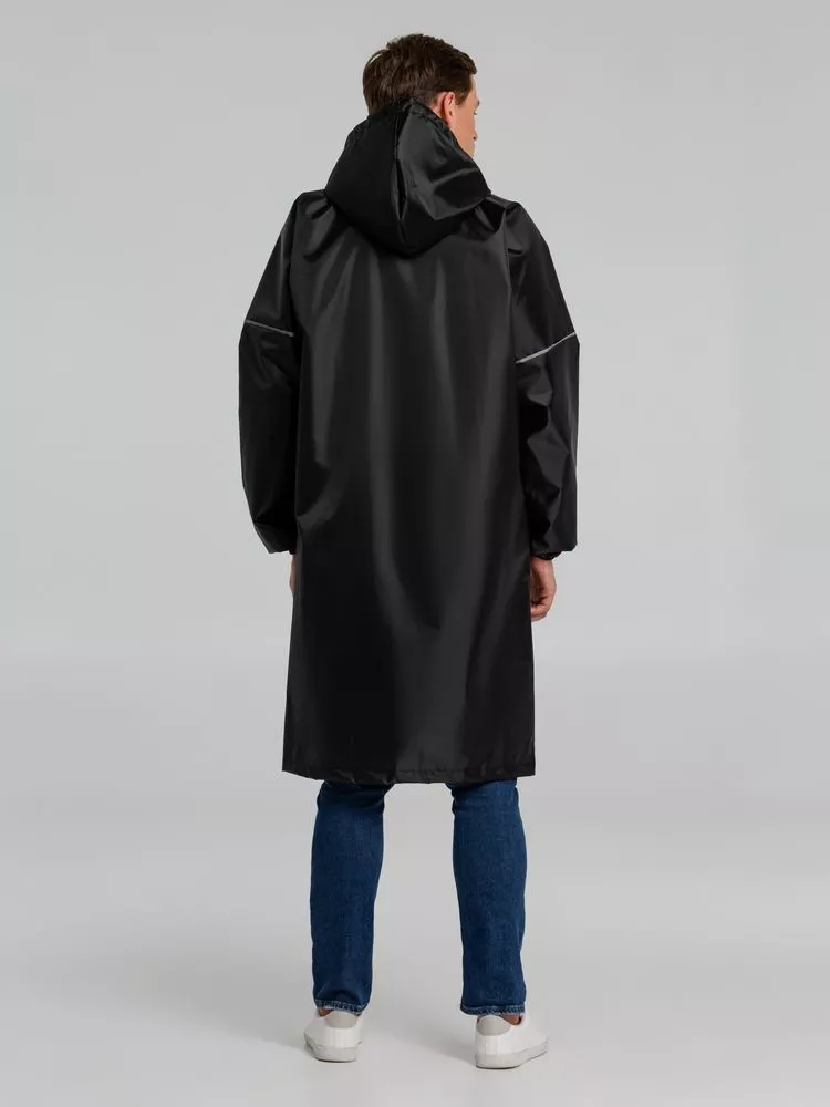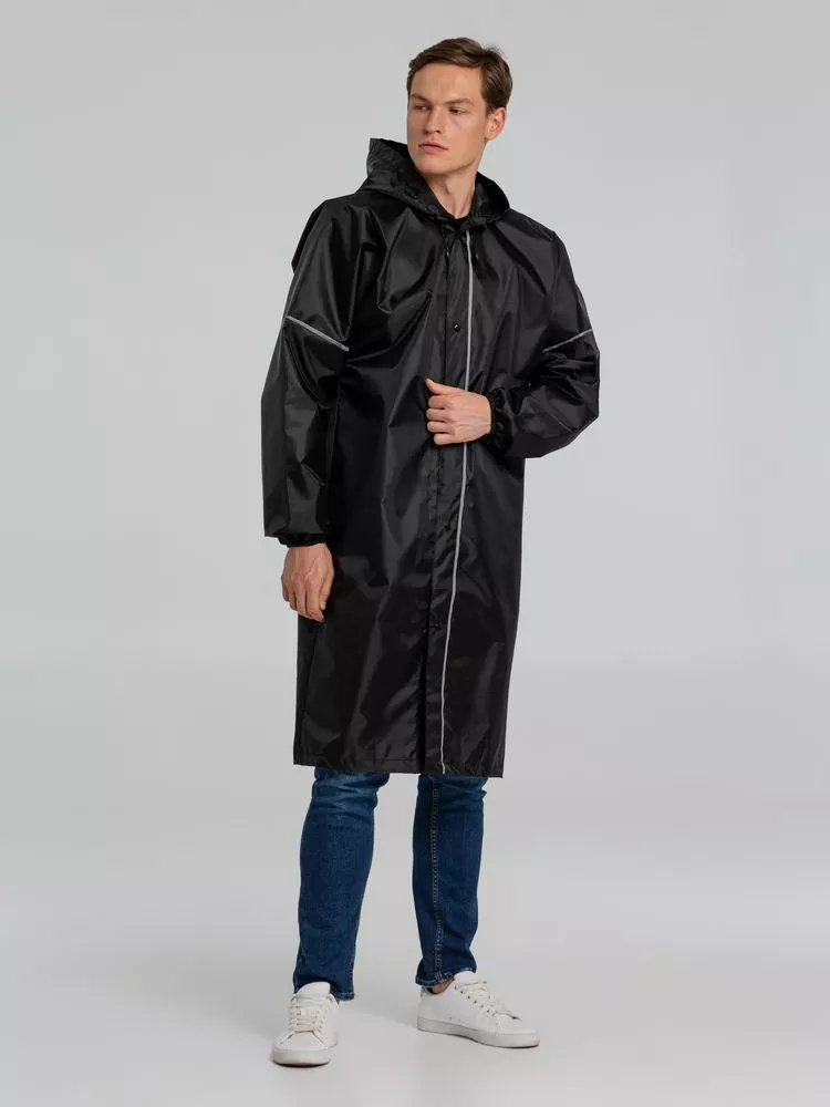 Плащ-дождевик из ткани оксфорд на кнопках с капюшоном. Световозвращающие элементы на рукавах и планке позволяют быть замеченным в темное время суток.
