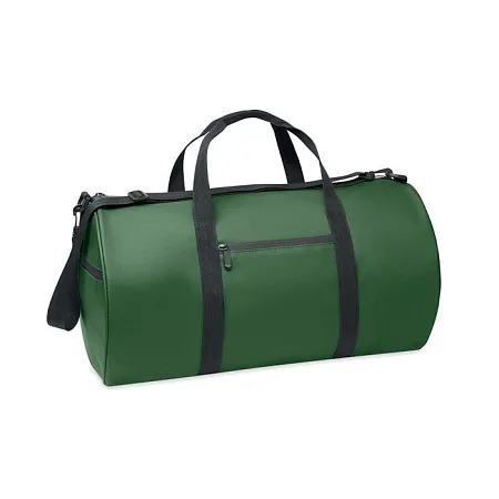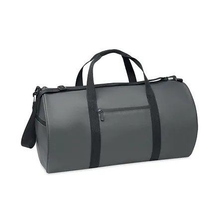 Duffle bag in 600D RPET polyester with PU coating. Front zippered pocket. Inside 210D RPET polyester lining. 1 side zippered compartment / 1 side mesh compartment. Zippered pocket inside.