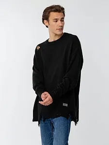 Оверсайз джемпер с круглым вырезом и рваными краями. Ворот, манжеты и низ изделия выполнены резинкой.