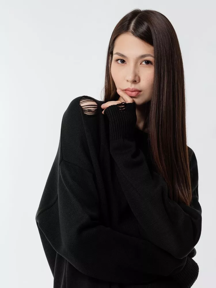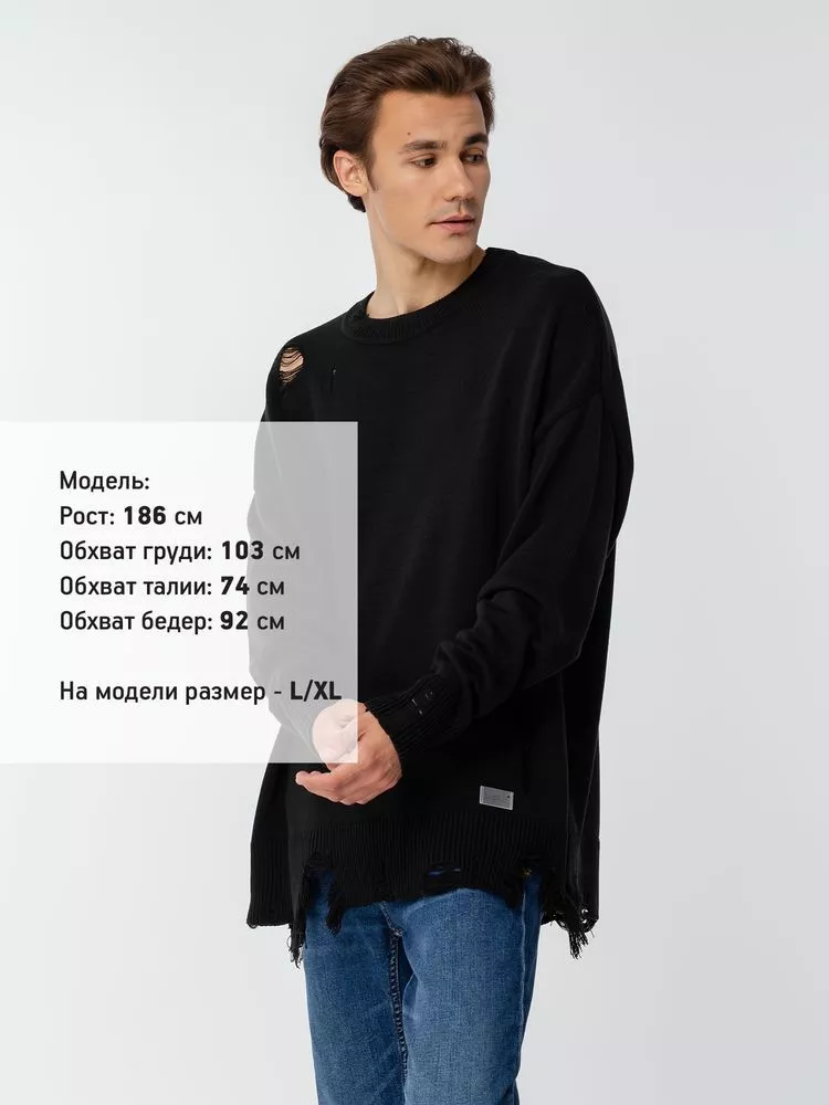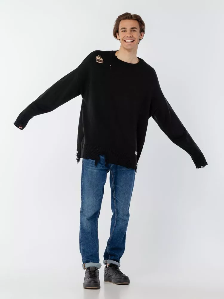 Оверсайз джемпер с круглым вырезом и рваными краями. Ворот, манжеты и низ изделия выполнены резинкой.