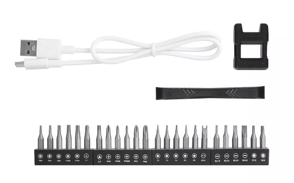 Электрическая отвертка в металлическом корпусе с магнитным патроном. Работает от аккумулятора емкостью 350 мАч, который полностью заряжается через кабель USB примерно за 70 минут. На корпусе есть светодиодный индикатор зарядки. Отвертка комплектуется 24 битами, подходящими для ремонта смартфонов, планшетов, ноутбуков и ПК, включая iPhone, iPad, MacBook Air и MacBook Pro, а также игровых консолей и контроллеров от Nintendo, PlayStation или XBox.