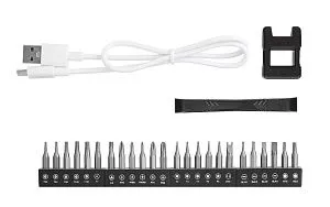В комплекте электрическая отвертка для точных работ, 24 биты, намагничиватель-размагничиватель, монтажная лопатка, кабель USB Type-C. Отвертка упакована в пластиковый кейс.- Число оборотов холостого хода: 300 об/мин