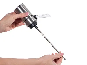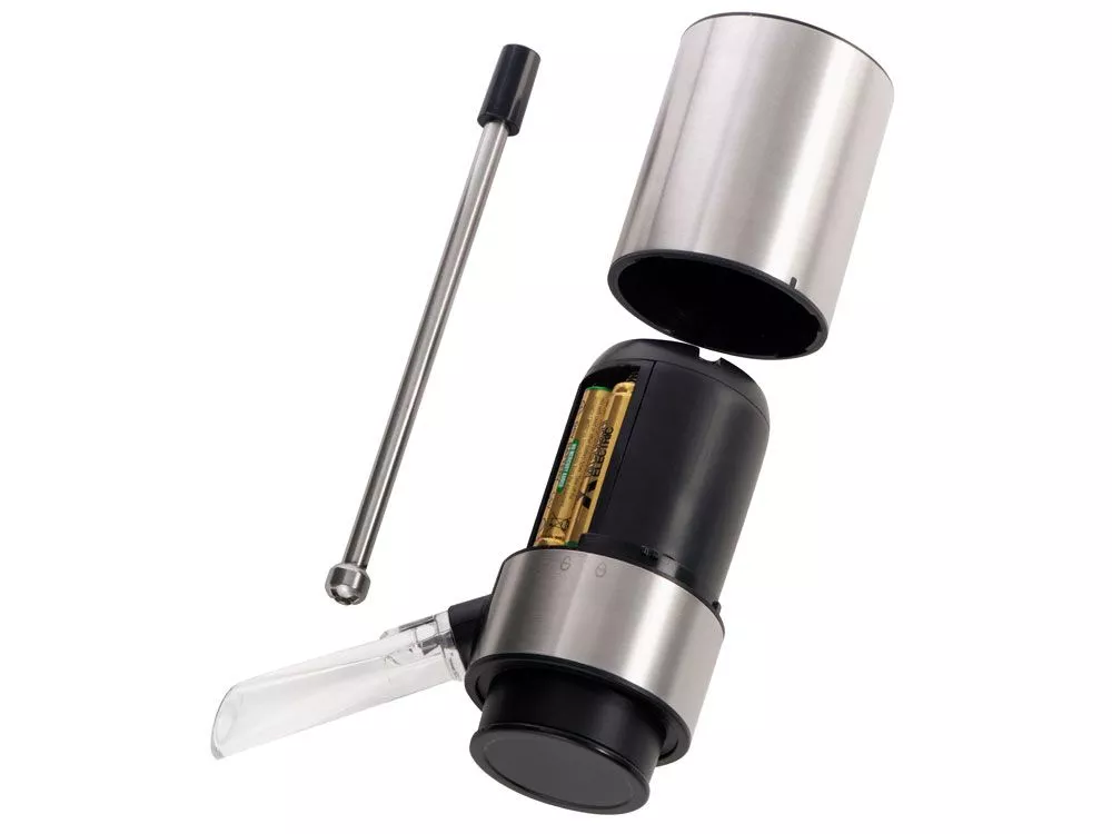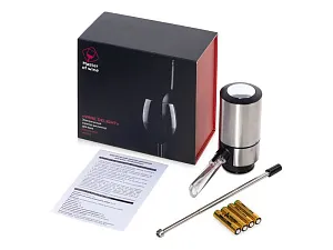 Автоматический аэратор от Master of Wine разливает вино по бокалам необычным образом: вам просто нужно установить его на горлышке бутылки и нажать на кнопку, и из трубки аэратора польется насыщенное кислородом вино. Как пользоваться: 1. наденьте трубку на нижнюю часть аэратора; 2. вытяните трубку так, чтобы кончик доставал до дна бутылки; 3. установите аэратор на горлышке; 4. откройте клапан аэрации, установив в режим ON 5. подставьте бокал под акриловую прозрачную трубку и нажмите на кнопку. Готово! Для промывки аэратора наполните бутылку чистой водой и прогоните весь объем через устройство. - прост в использовании - для тихих вин. которые нуждаются в аэрации - поставляется в комплекте с 4 батарейками ААА - фирменная упаковка бренда — уже можно дарить! - дизайн продолжает общий стиль Master of Wine, можно сочетать с другими товарами бренда для создания сета - выполнен из безопасных для человека материалов, не искажающих вкус, цвет и запах напитка - инструкция на русском языке в комплекте Гравировка (оптоволоконный лазер) (Без чернения) на данный товар осуществляется бесплатно. Оплачивается только настройка оборудования в размере 950 рублей на весь тираж.