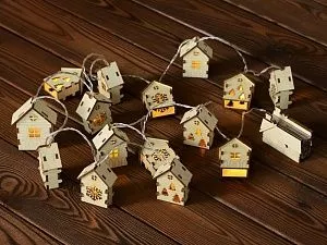 Светодиодная новогодняя елочная гирлянда постоянного свечения с домиками из натуральной березовой фанеры. Работает от 2-х батареек АА (в комплекте). Гравировка (Без чернения) на данный товар осуществляется бесплатно. Оплачивается только настройка оборудования в размере 500 рублей на весь тираж.