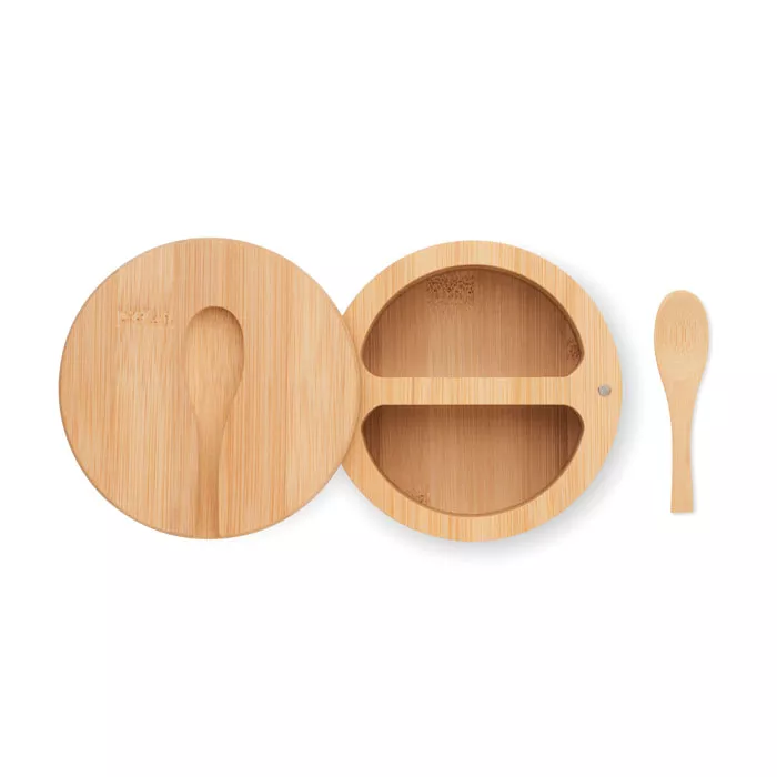 Солонка и перечница из бамбука со встроенной сервировочной ложкой. Два отделения. Съемная крышка.
