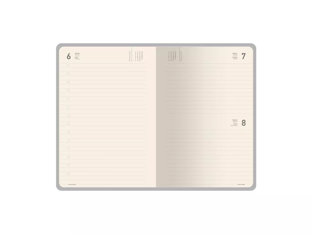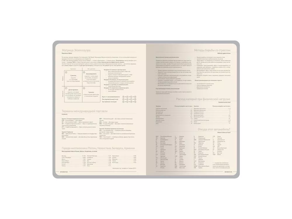 Датированный ежедневник Megapolis Loft формата А5 от Bruno Visconti - это не просто инструмент для планирования, а стильный аксессуар, который подчеркнет вашу индивидуальность. Твердая обложка из высококачественной экокожи максимально повторяет фактуру натуральной кожи. Скругленные углы блока и обложки позволяют уберечь листы от замятий и придают ежедневнику утонченности и благородства. Для удобства навигации предусмотрена закладка-ляссе в цвет обложки. Внутренний блок выполнен из бежевой бумаги плотностью 70 г/кв.м и содержит 14 страниц справочной информации, а также датированные страницы с почасовой разметкой.