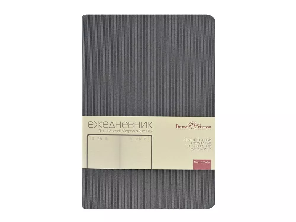 Еще один представитель ежедневников с гибкой обложкой – Megapolis Slim flex, отличительной особенностью которого является двойное ляссе, окрашенный срез, рифленая фактурная обложка. Megapolis Slim Flex — для динамичных людей, живущих в ритме большого города. Тиснение (Блинт) на данный товар осуществляется бесплатно. Оплачивается только настройка оборудования в размере 6200 рублей на весь тираж.