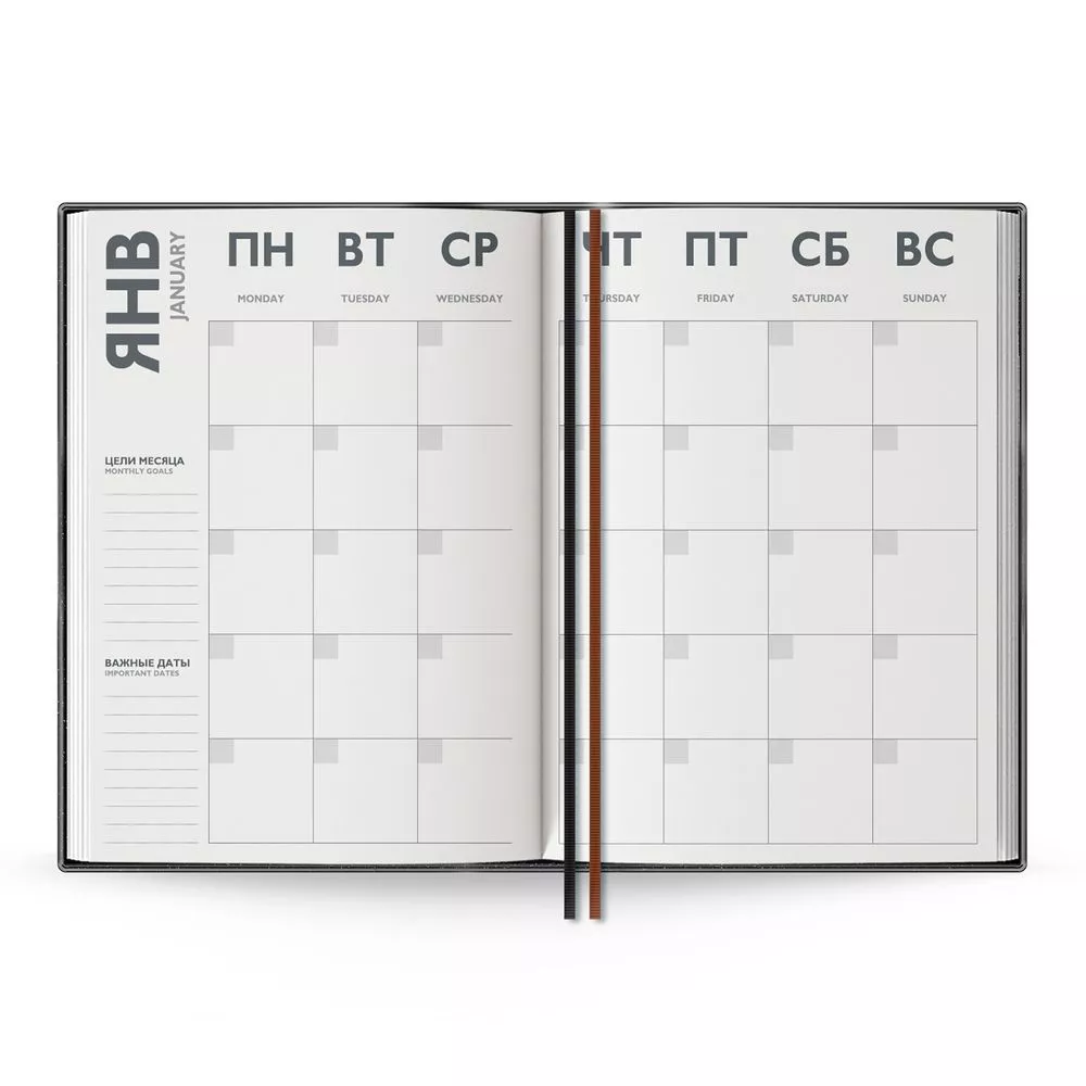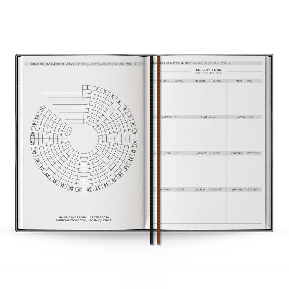 Ежедневник с гибкой обложкой и закладкой из искусственной кожи, дополнен капталом и двойным ляссе.