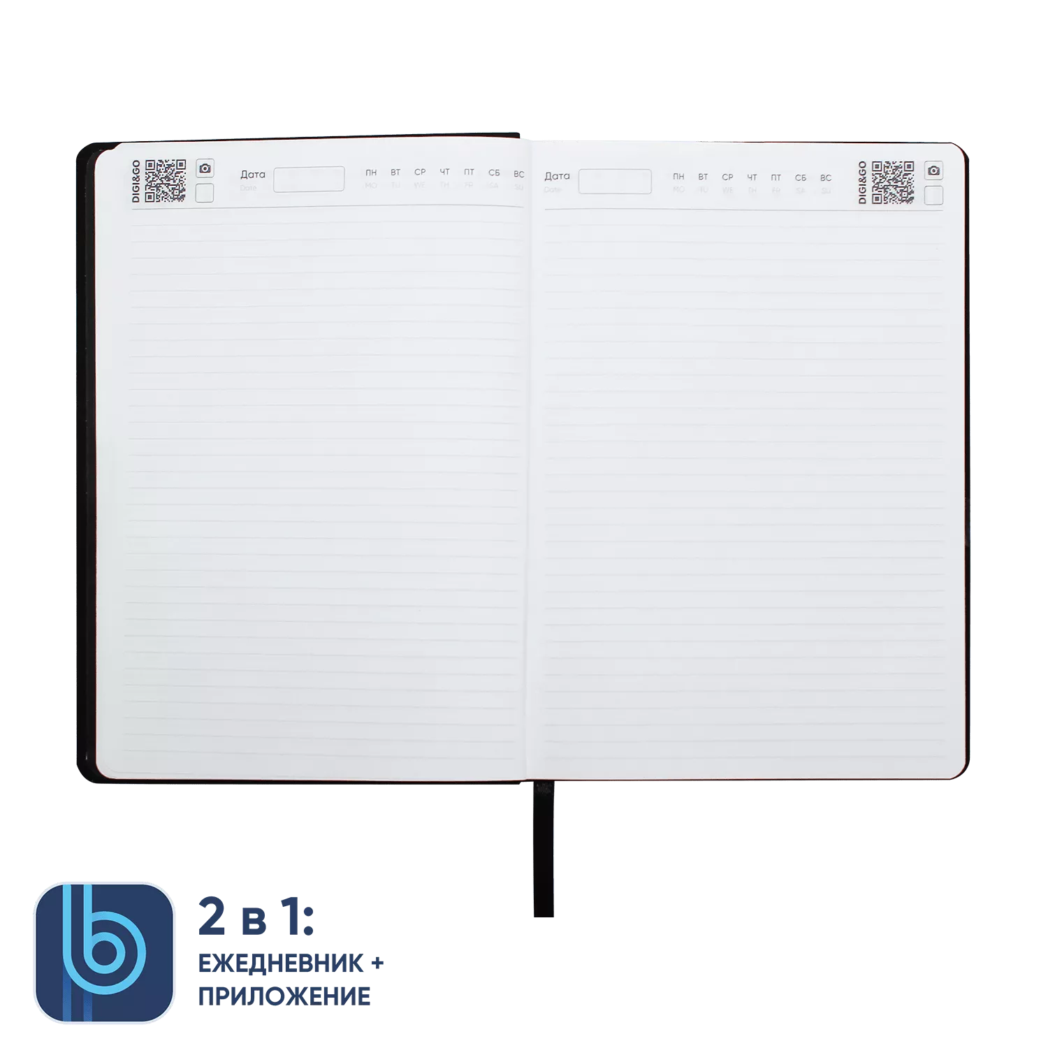 DIGI – фотоснимок страницы ежедневника. На каждой странице ежедневника расположен QR код, который открывает режим камеры сразу в приложении. Остается только нажать кнопку.