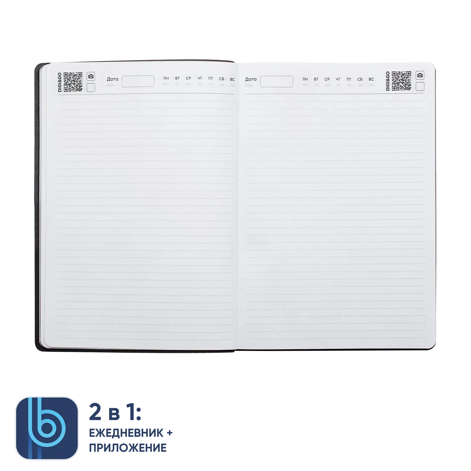 DIGI – фотоснимок страницы ежедневника. На каждой странице ежедневника расположен QR код, который открывает режим камеры сразу в приложении. Остается только нажать кнопку.