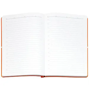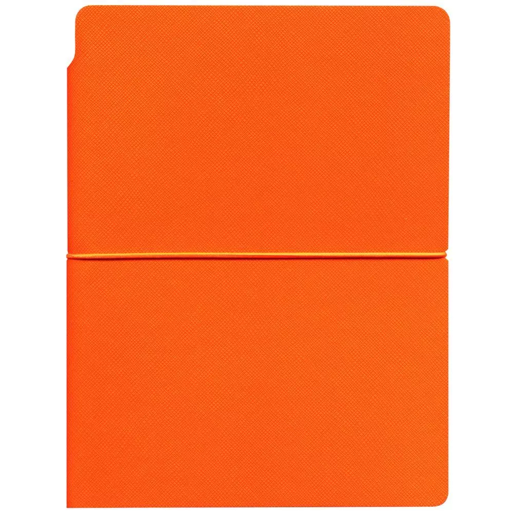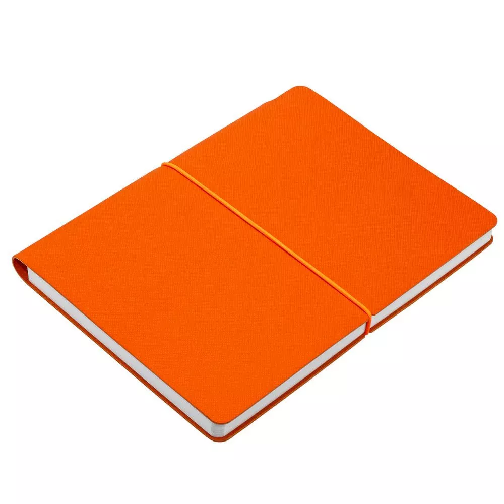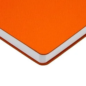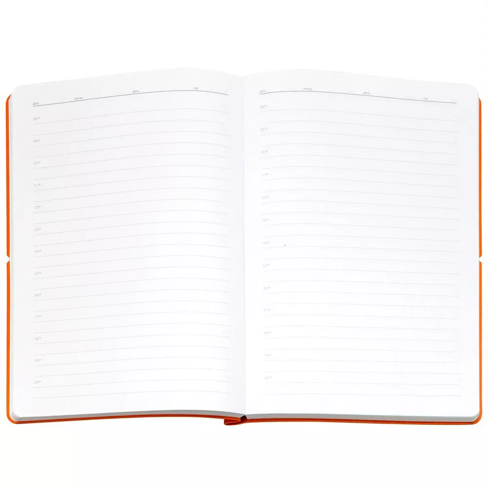 Ежедневник с гибкой обложкой выполнена из материала Nice Touch, оранжевый и Latte, оранжевый (внутренняя часть обложки), дополнен горизонтальной резинкой в цвет обложки. Внутри корешка — специальное место для крепления ручки размером до 15х1 см.