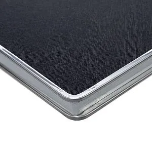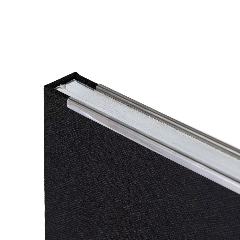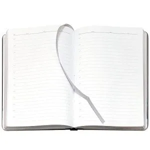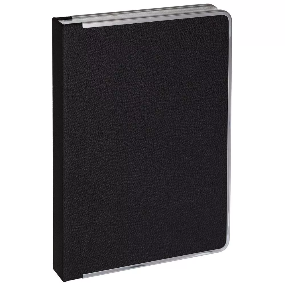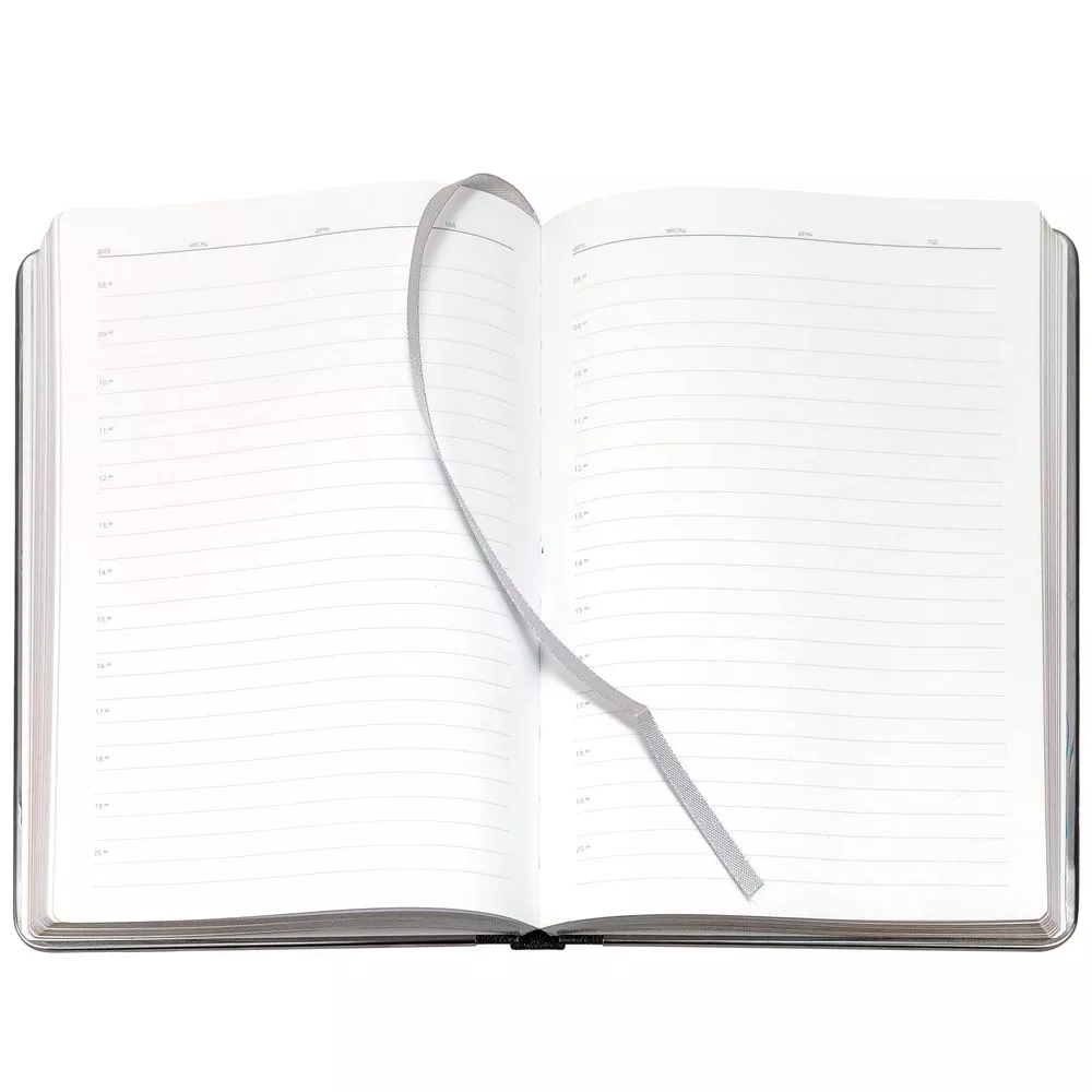 Ежедневник с твердой обложкой и серебристым обрезом, выполнен из материала Saffian, черный, дополнен серым ляссе и металлическими рамками.