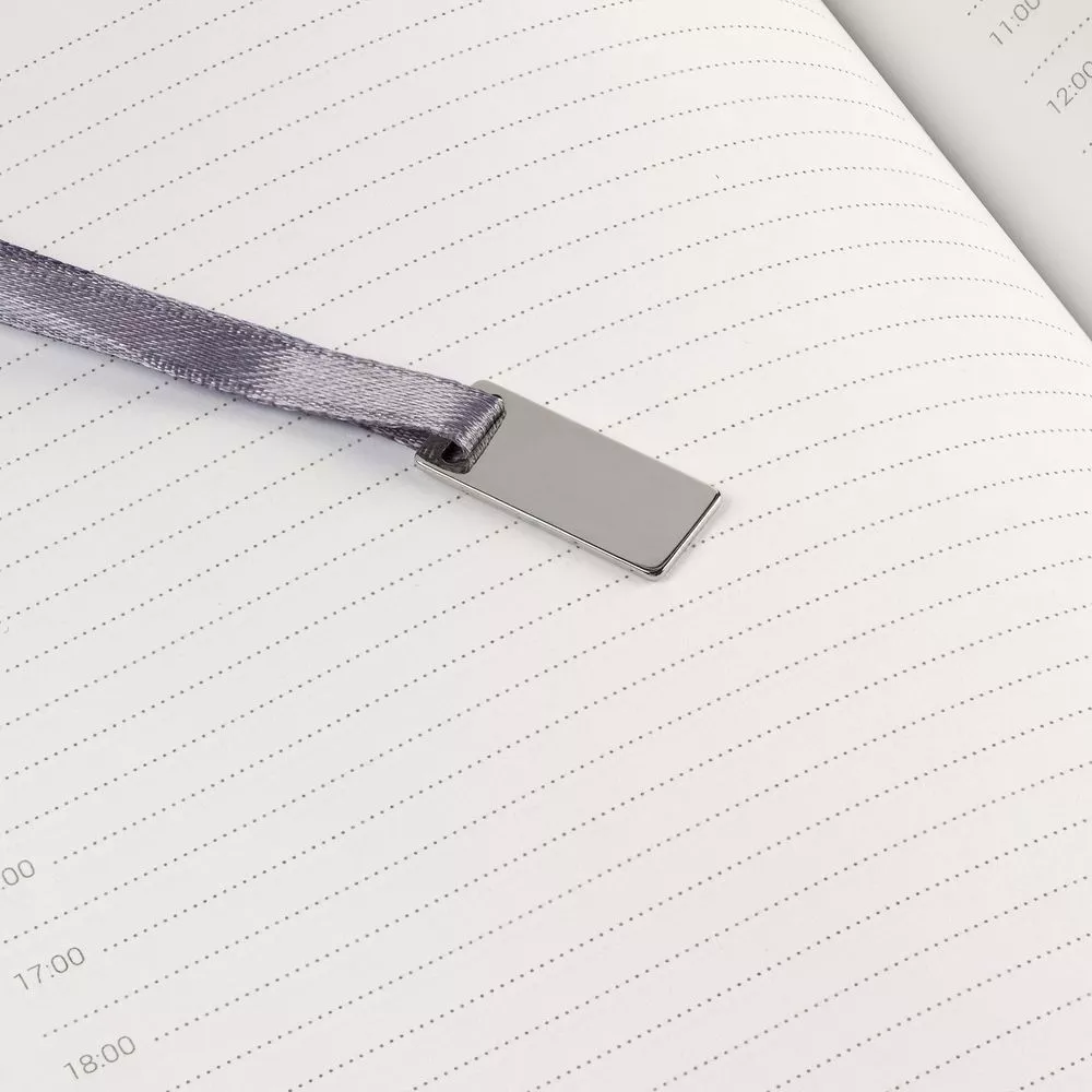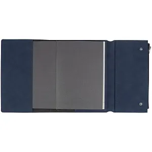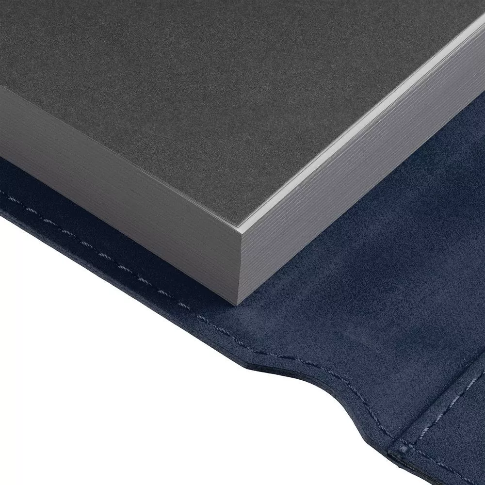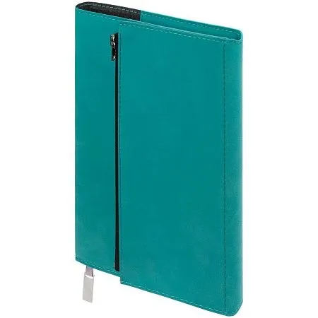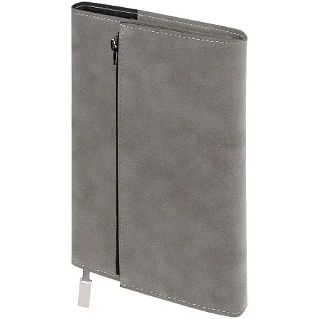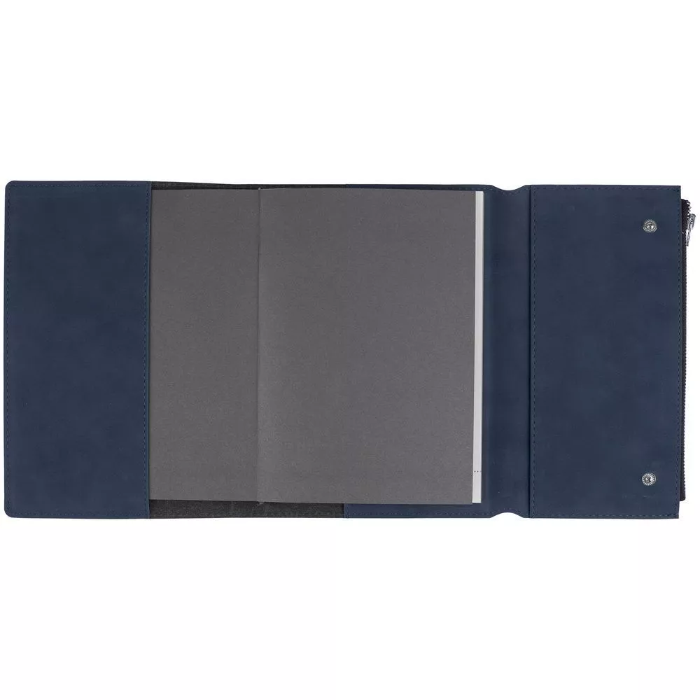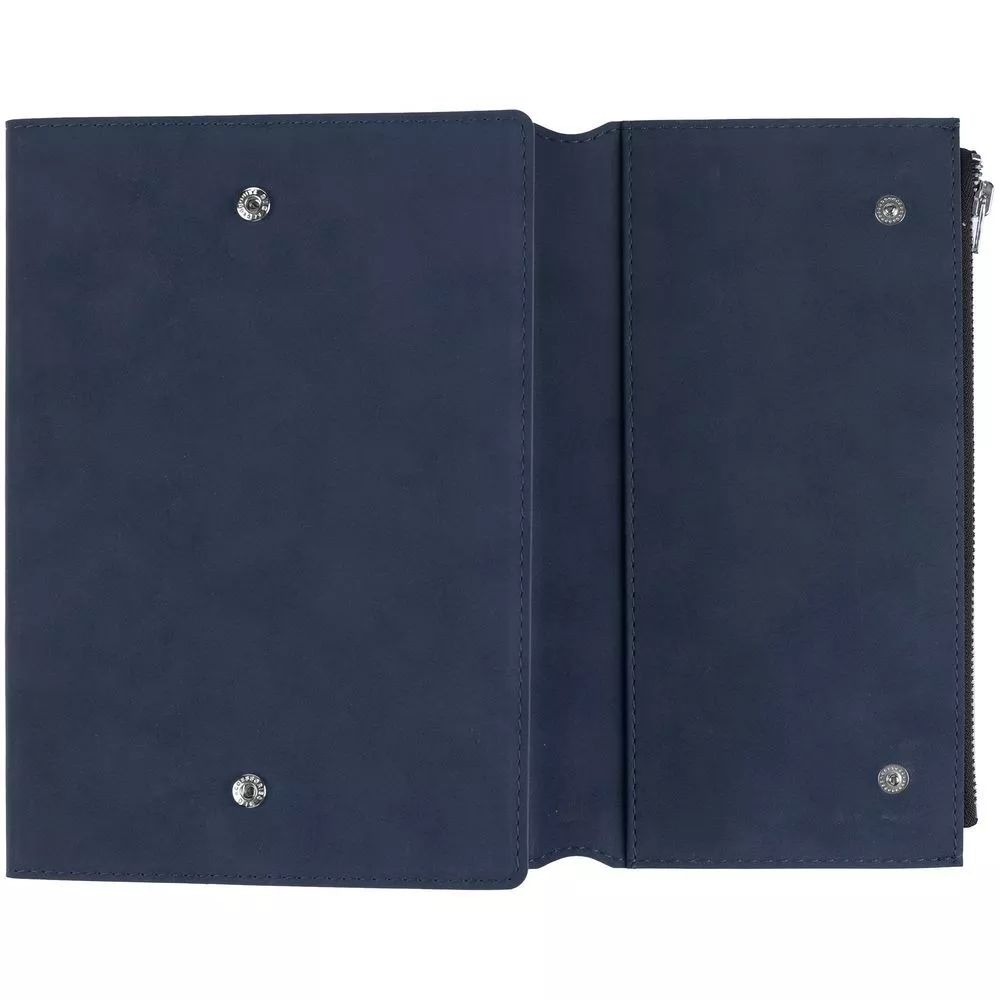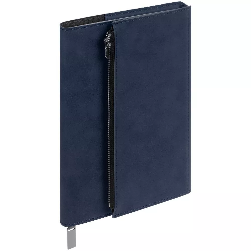 Ежедневник в гибкой суперобложке c карманом на молнии, выполнен из материала Nubuck, темно-синий ХХ. Дополнен капталом и металлической шильдой на ляссе серого цвета.