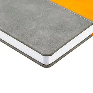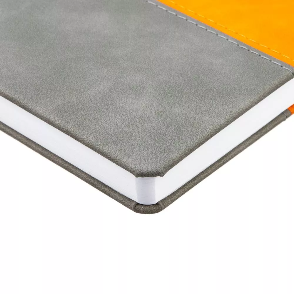 Ежедневник с твердой обложкой, без поролона, со сшивкой материалов Nubuck Touch, серый СС, и Nubuck Touch оранжевый ОО, дополнен двойным ляссе и петлей-резинкой для ручки.