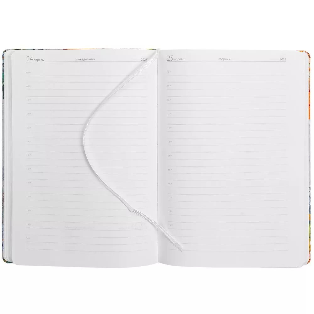 Ежедневник в твердой обложке из картона, дополнен ляссе белого цвета.
