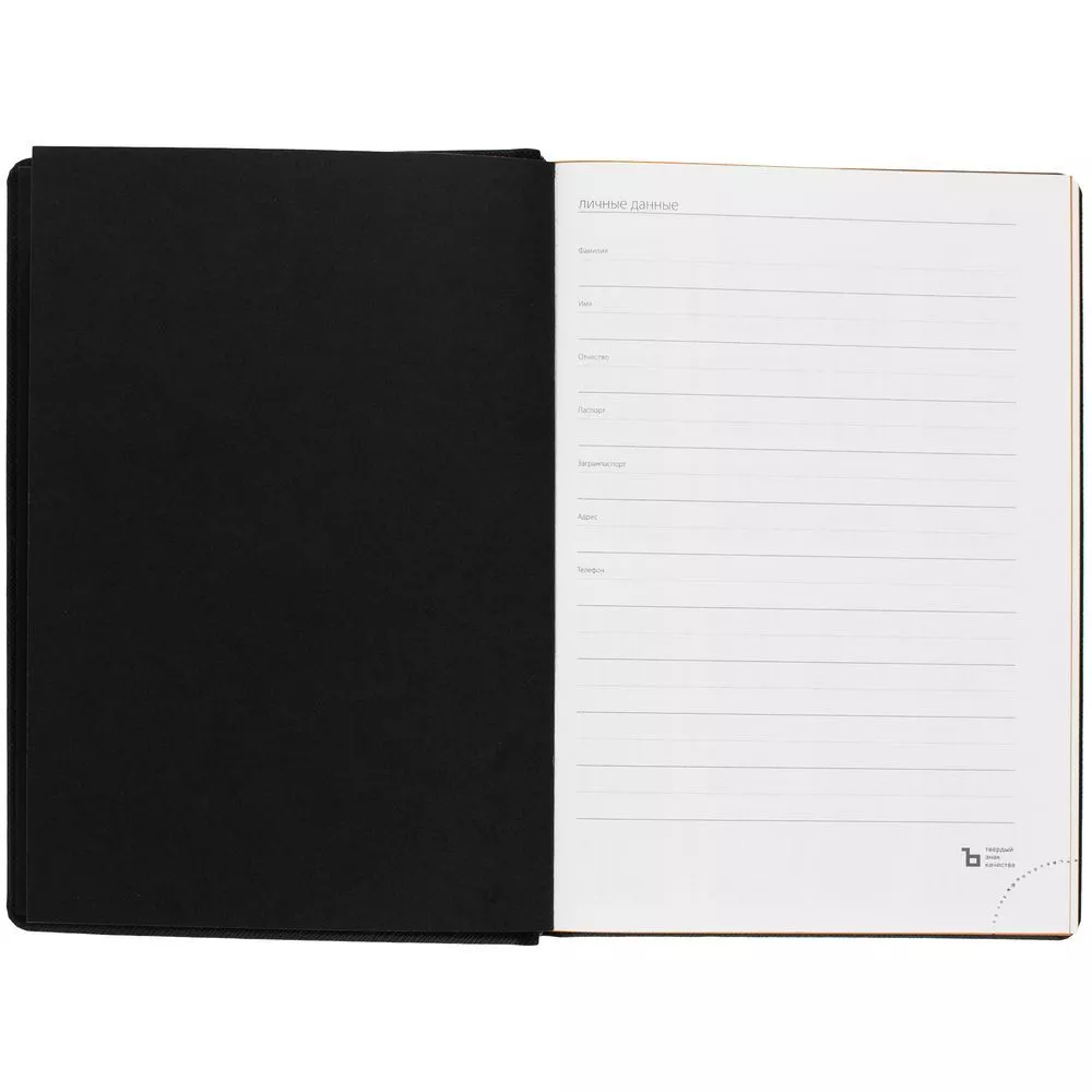 Твердая обложка выполнена из материалов Tenax, черный АА, и Corduroy, синий НН. Ежедневник дополнен капталом, резинкой для ручки и ляссе черного цвета.