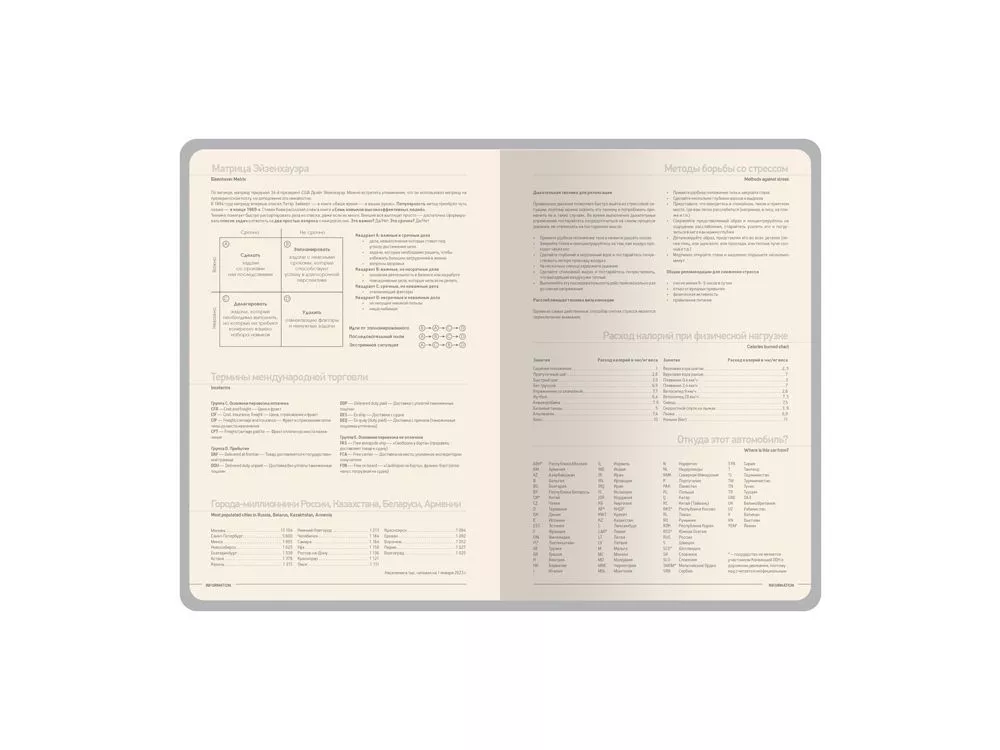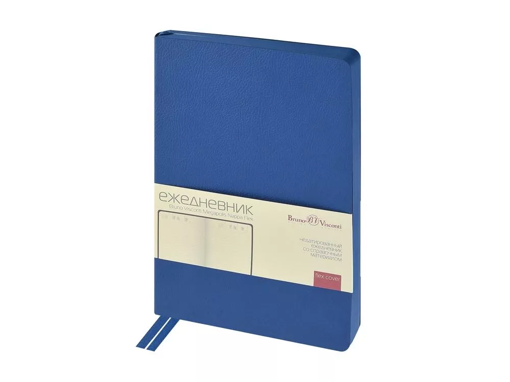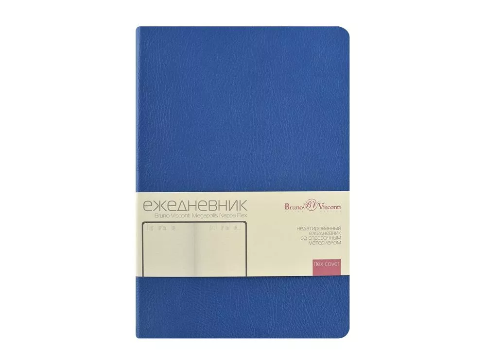 Обложка недатированного ежедневника Megapolis Nappa Flex ТМ Bruno Visconti произведена из искусственной кожи без применения переплетного картона, благодаря чему он легче и изящнее классических. Его можно свернуть в трубочку, обложка и блок не пострадают. При этом, для ежедневника формата А5 доступны те же опции, что и для любых других ежедневников — окрашенный обрез, крупнозернистая фактура искусственной кожи обложки, двойное ляссе 7 мм. Блок изготовлен из бежевой бумаги плотностью 70 г/м2 и помимо раздела для планирования рабочего времени включает в себя 12 страниц справочной информации. Тиснение (Блинт) на данный товар осуществляется бесплатно. Оплачивается только настройка оборудования в размере 6200 рублей на весь тираж.