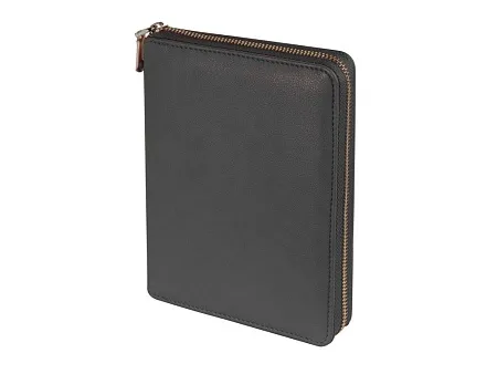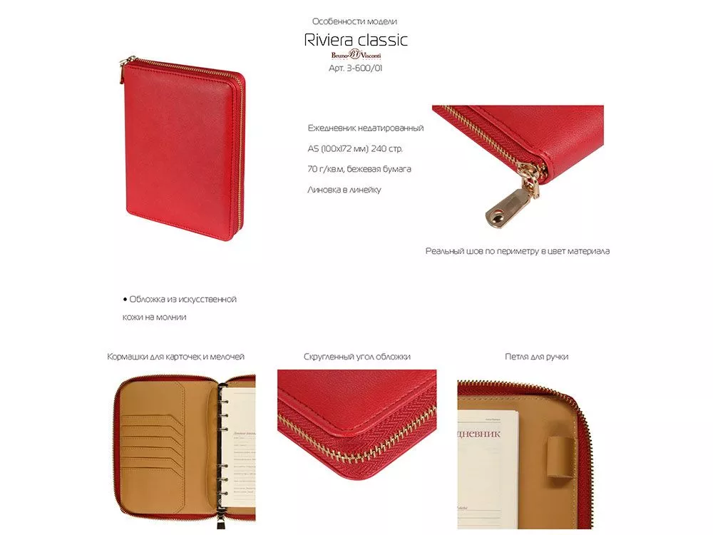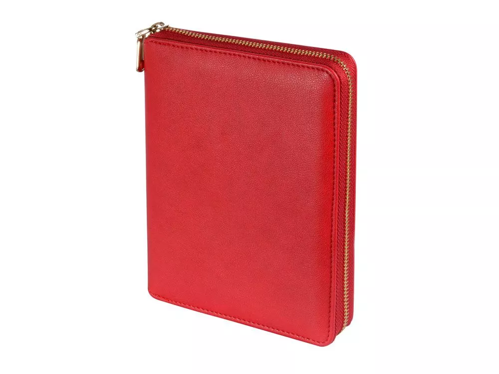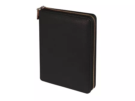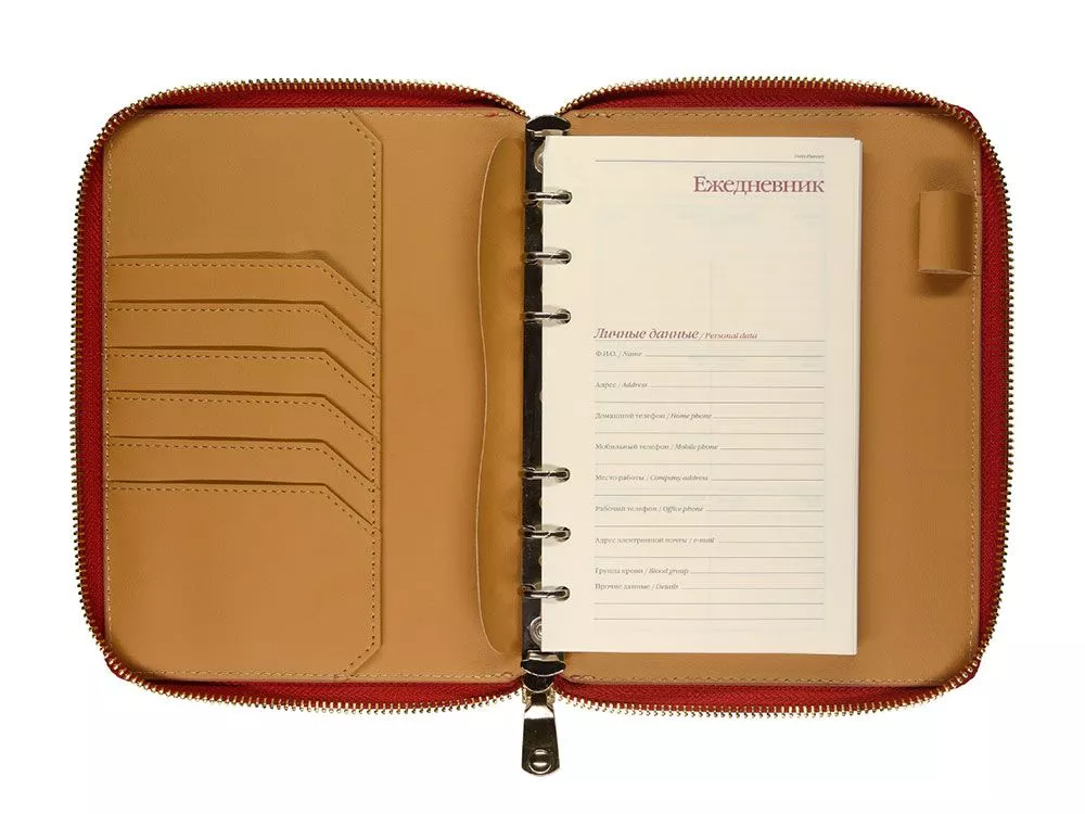 Великолепный ежедневник из качественной искусственной кожи, который заменит вам портмоне и органайзер. В ежедневнике предусмотрены карманы для карточек, сменный блок на кольцах. Внутри достаточно места для ручки и даже для мобильного телефона. Сам ежедневник закрывается на молнию. Его удобно брать с собой и на переговоры, и на деловой обед. Блок отпечатан в 2 цвета на бежевой бумаге плотностью 70 г/м2. Тиснение (Блинт) на данный товар осуществляется бесплатно. Оплачивается только настройка оборудования в размере 5500 рублей на весь тираж.