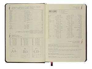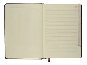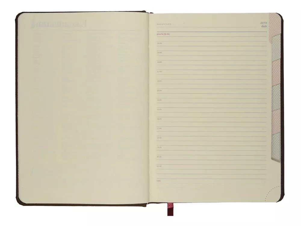 Незаменимый помощник в деле эффективного планирования благодаря высокому качеству производства и тщательно продуманных элементов: мягкая бархатистая обложка со скругленными уголками и строчкой по периметру в цвет, вырубные индексы с цветной маркировкой, разбивающей блок на месяцы, закладка-ляссе, перфорированные углы блока, линовка листов с указанием времени суток.