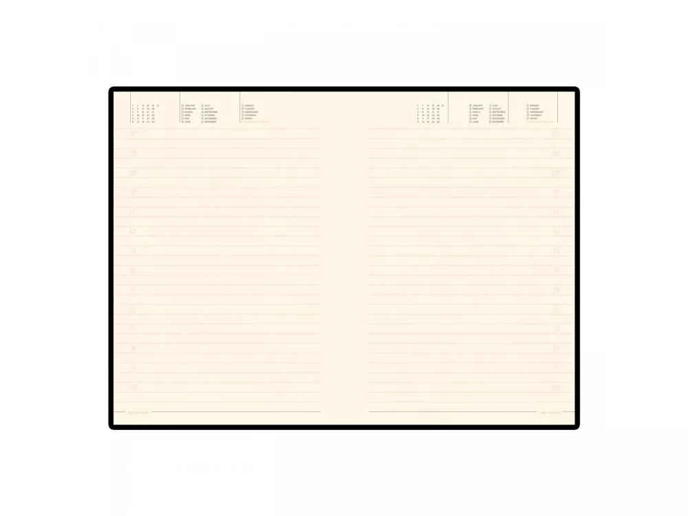 Недатированные деловой ежедневник Tintoretto. Реальный шов по периметру в цвет материала Гибкий мягкий материал обложки прекрасно подходит для нанесения тиснения. Ежедневники выпускаются в формате В5, его размеры составляют 185 х 230 мм. Блок - 136 листов соединен полускрытым металлическим гребнем. Для блока используется высококачественная бежевая бумага, обладающая плотностью 70 грамм. В начале ежедневника расположены страницы со справочным материалом.