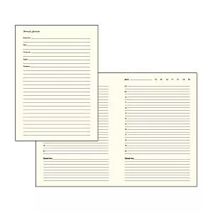 Первая страница ежедневника представляет собой анкету личных данных владельца. Каждая последующая страница имеет почасовую нумерацию, поле для заметок и поле для даты.