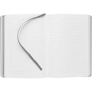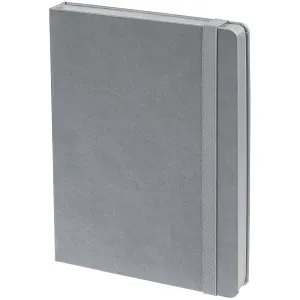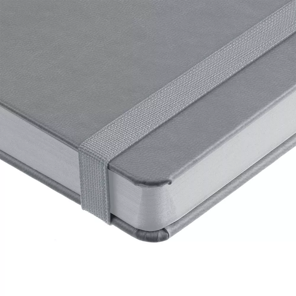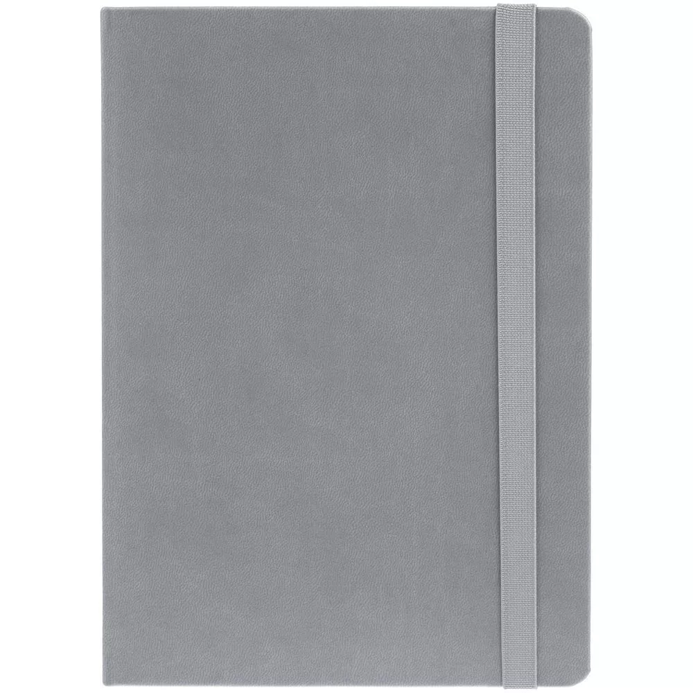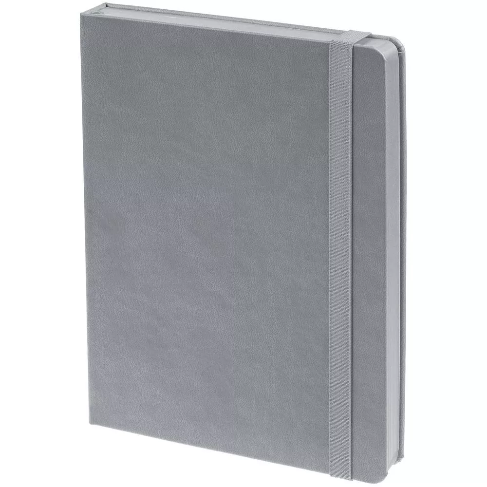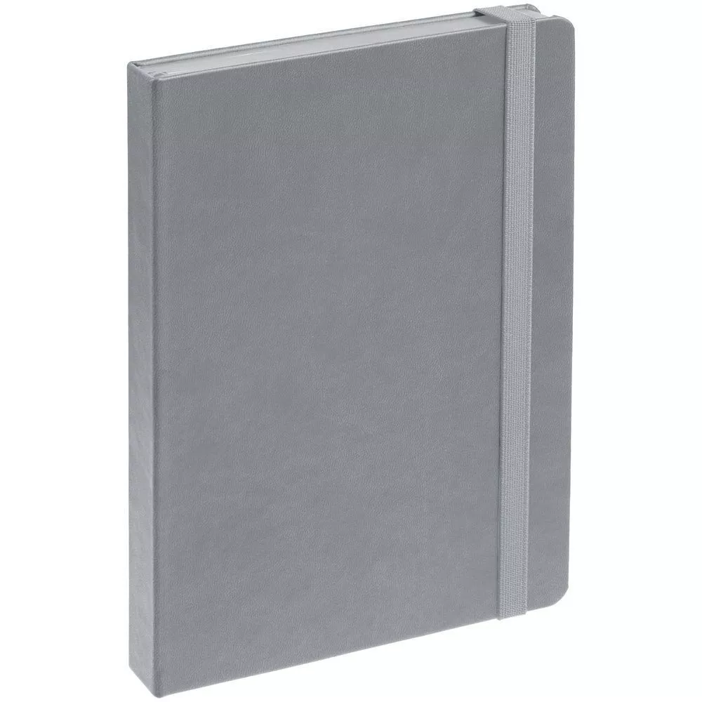 Ежедневник с твердой обложкой, выполнен из материала Latte, серый СС, обрез серого цвета, дополнен резинкой и ляссе серого цвета.