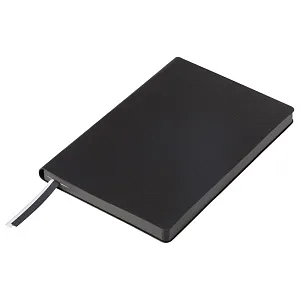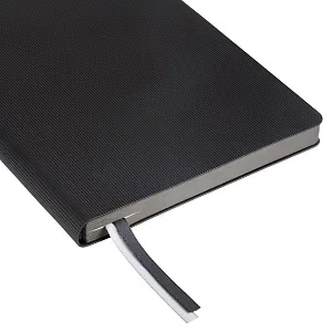 Недатированный ежедневник в строгой деловой лаконичной тональности. Современный технологичный дизайн, спокойные природные цвета. Гибкая матовая обложка со скругленными уголками выполнена из искусственной кожи, имитирующей покрытие в стиле Hi-Tech. Переплетный материал с вертикальным рифлением, бархатистый, со слегка прорезиненным эффектом. За счет интересной рельефной фактуры прослеживается игра цвета при перемене освещения. Цвет – классический черный, плотный, однородный. Создает органичный сдержанный тандем с матовыми форзацем и нахзацем серого цвета. Срез матовый, в тон обложки. Страницы со скругленными уголками приятного глазу теплого светло-кремового цвета. Выполнены из гладкого шелковистого офсета. Ежедневник дополнен двойным атласным ляссе из лент серого и черного цветов, имеющих глянцевый отлив.