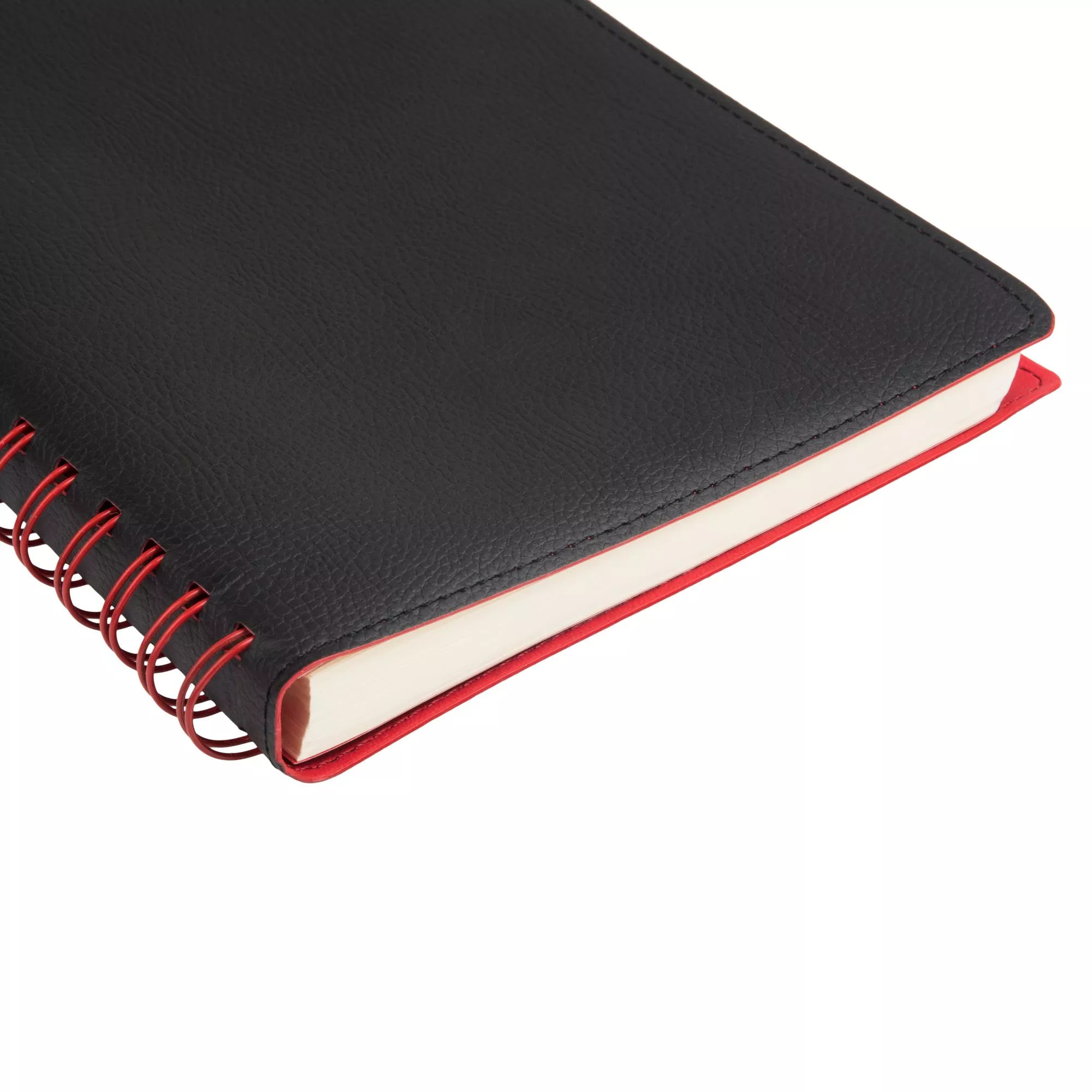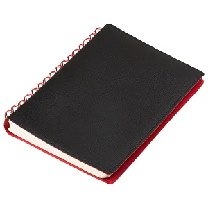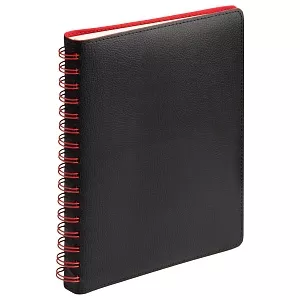 Недатированный ежедневник в гибкой обложке со скругленными уголками из искусственной кожи. Обложка выполнена из сшивки двух материалов. Внешний материал обложки – матовый, с некрупным рельефом под натуральную кожу. Цвет – черный, насыщенный, динамичный, однородный. Внутренний материал обложки – Latte – бархатистый, мелкозернистый, ярко-красного цвета. По периметру обложки выполнена прошивка в тон. Форзац и нахзац контрастные, ярко-красного цвета. Теплые кремовые страницы со скругленными уголками выполнены из гладкого шелковистого офсета. Срез матовый, в тон страниц. Ежедневник надежно скреплен полускрытой пружиной в цвет внутреннего материала обложки. Изделие комплектуется вкладышем с цветными стикерами и индивидуальной упаковкой.Упаковка: пластиковая коробка - есть