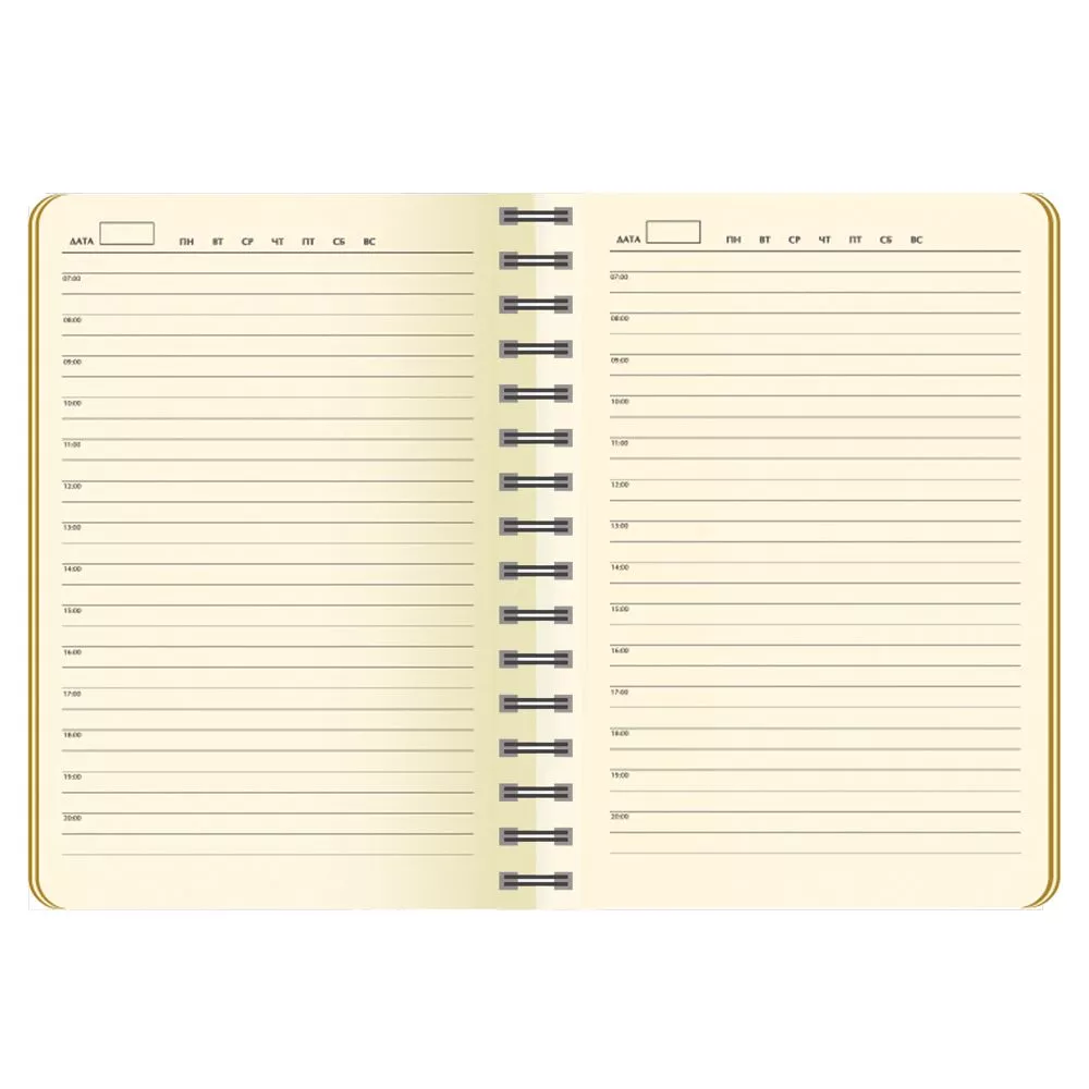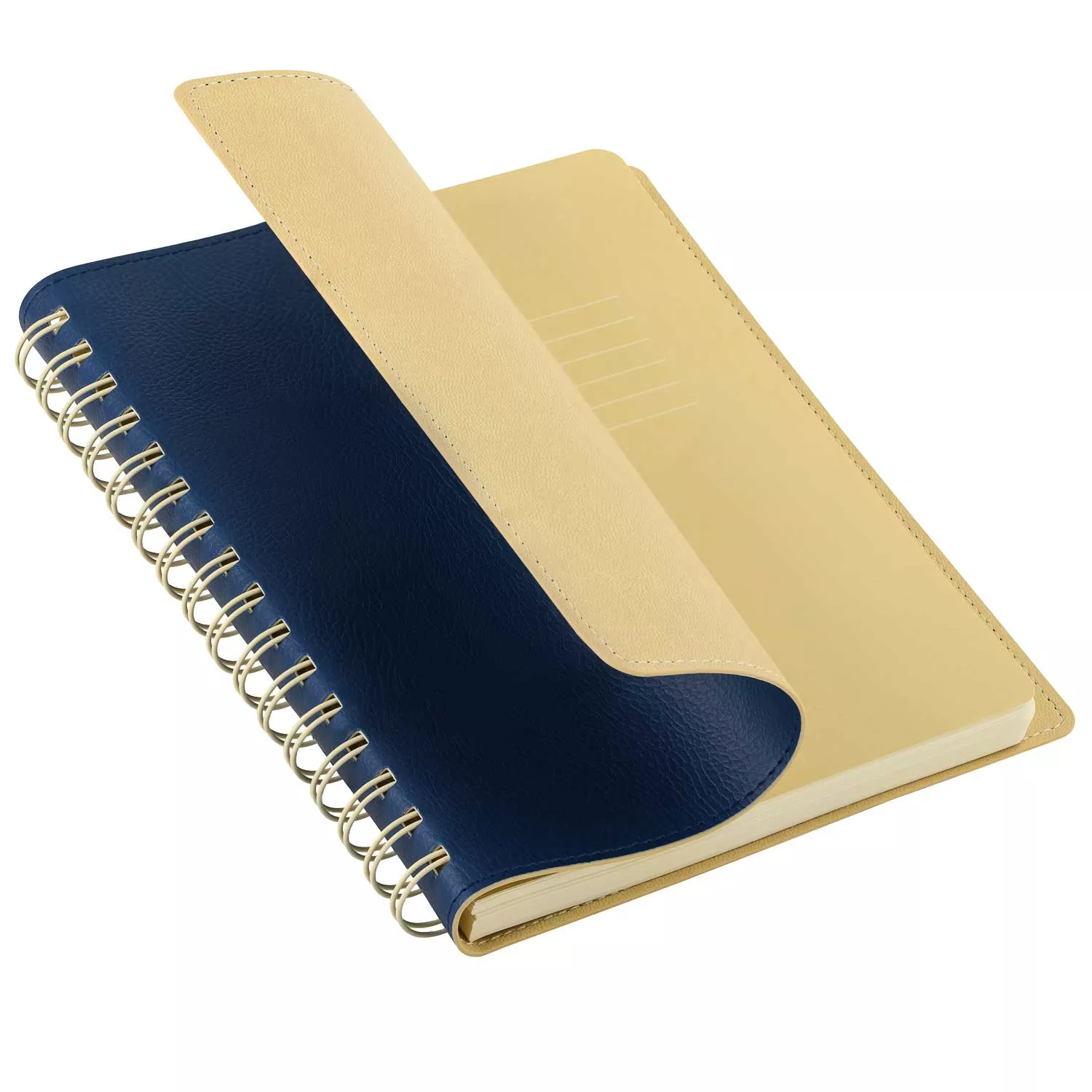 Недатированный ежедневник в гибкой обложке со скругленными уголками из искусственной кожи. Обложка выполнена из сшивки двух материалов. Внешний материал обложки – матовый, с некрупным рельефом под натуральную кожу. Цвет – синий, насыщенный, динамичный, однородный. Внутренний материал обложки – Latte – бархатистый, мелкозернистый, однородного бежевого цвета. По периметру обложки выполнена прошивка в тон. Форзац и нахзац контрастные, бежевого цвета. Теплые кремовые страницы со скругленными уголками выполнены из гладкого шелковистого офсета. Срез матовый, в тон страниц. Ежедневник надежно скреплен полускрытой пружиной в цвет внутреннего материала обложки. Изделие комплектуется вкладышем с цветными стикерами и индивидуальной упаковкой.Упаковка: пластиковая коробка - есть