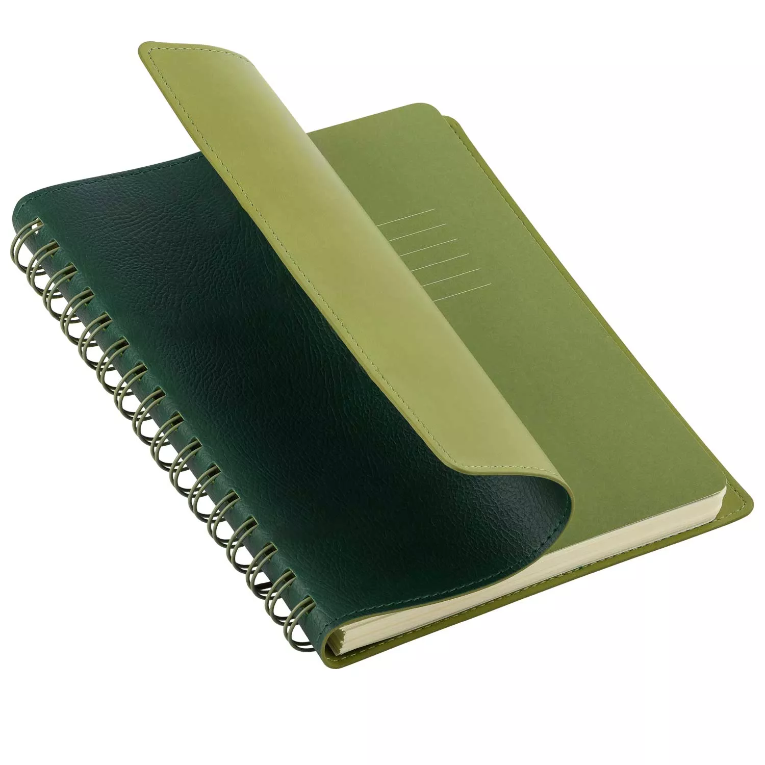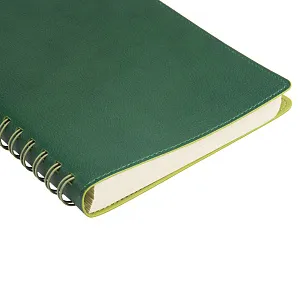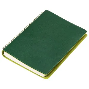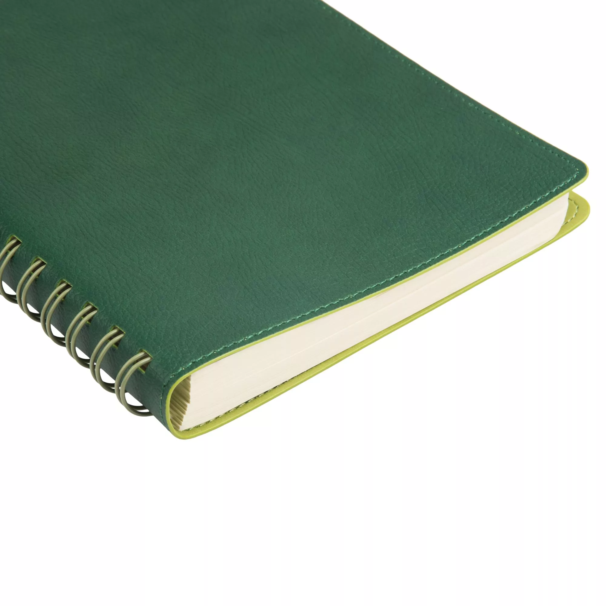 Недатированный ежедневник в гибкой обложке со скругленными уголками из искусственной кожи. Обложка выполнена из сшивки двух материалов. Внешний материал обложки матовый, с некрупным рельефом под натуральную кожу. Цвет – зеленый, приглушенный, однородный. Внутренний материал обложки – Latte – бархатистый, мелкозернистый, однородного яркого салатового цвета. По периметру обложки выполнена прошивка в тон. Форзац и нахзац контрастные, салатовые. Теплые кремовые страницы со скругленными уголками выполнены из гладкого шелковистого офсета. Срез матовый, в тон страниц. Ежедневник надежно скреплен полускрытой пружиной в цвет внутреннего материала обложки. Изделие комплектуется вкладышем с цветными стикерами и индивидуальной упаковкой.Упаковка: пластиковая коробка – есть