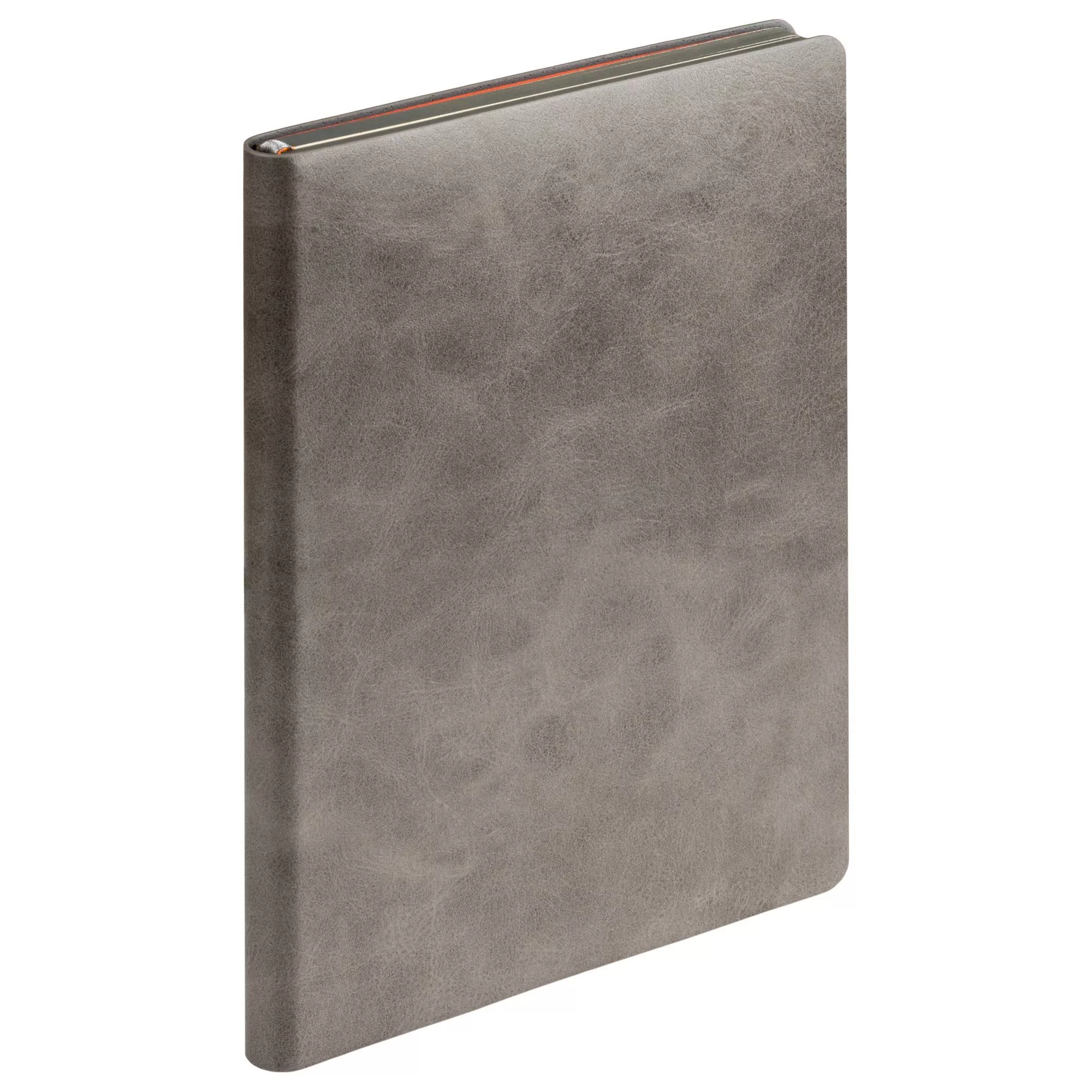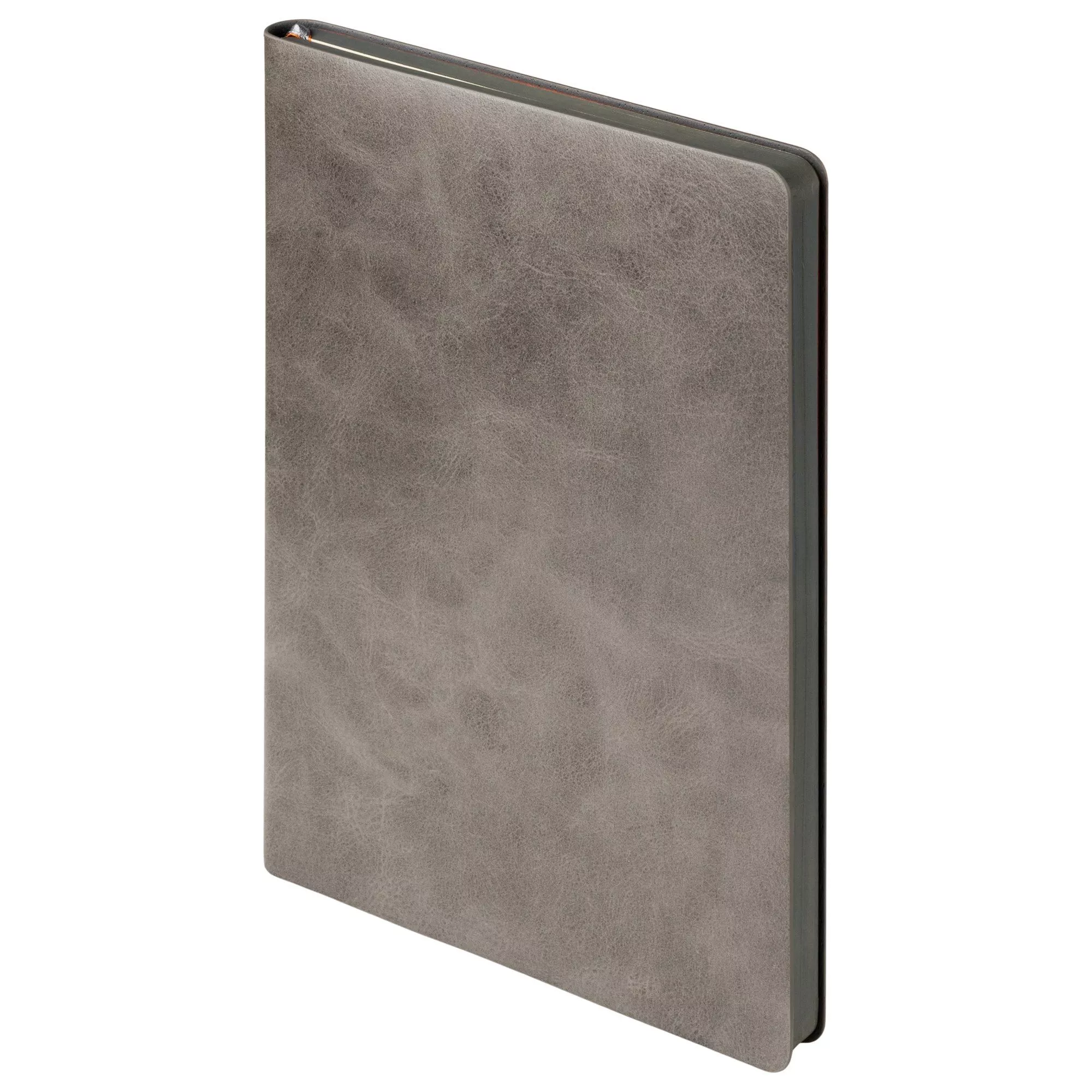 Яркий и в то же время лаконичный недатированный ежедневник выполнен в современном дизайне. Цветовая палитра составлена из контрастных ярких и приглушенных тонов. Гибкая обложка из искусственной полуглянцевой кожи (материал Voyage/Atlas) со скругленными уголками. Поверхность слегка фактурная, с едва ощутимой сеткой мелких морщинок и прожилок. Цвет – серый, естественный, спокойный, с неоднородным рисунком, напоминающим мраморные разводы и мягкими переходами тона от темного к более светлому. Форзац и нахзац матовые, сочного оранжевого цвета. Теплые кремовые страницы со скругленными уголками выполнены из гладкого шелковистого офсета. Срез серый, матовый. Изделие дополнено двойным атласным ляссе, составленным из лент серого и оранжевого цветов. Ленты имеют легкий блеск, ширина каждой 6 мм.Упаковка: пластиковая коробка - есть