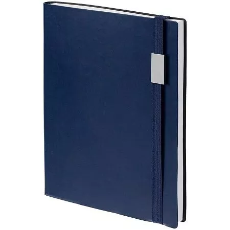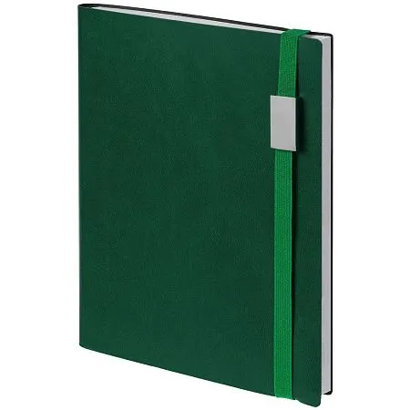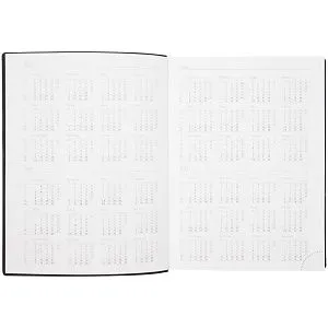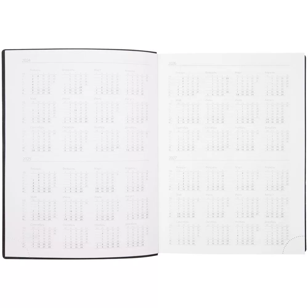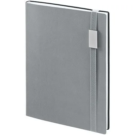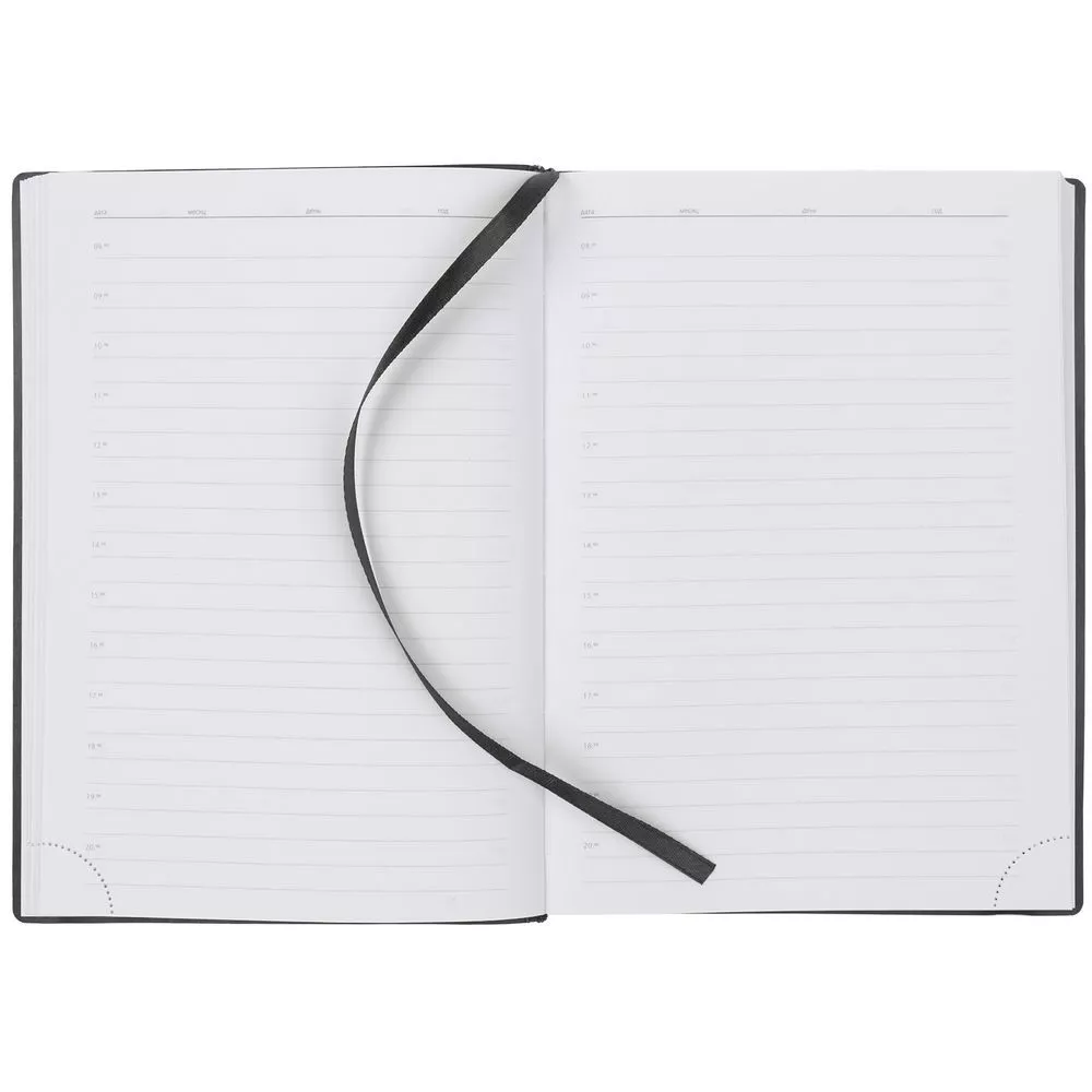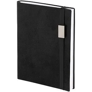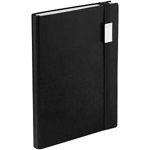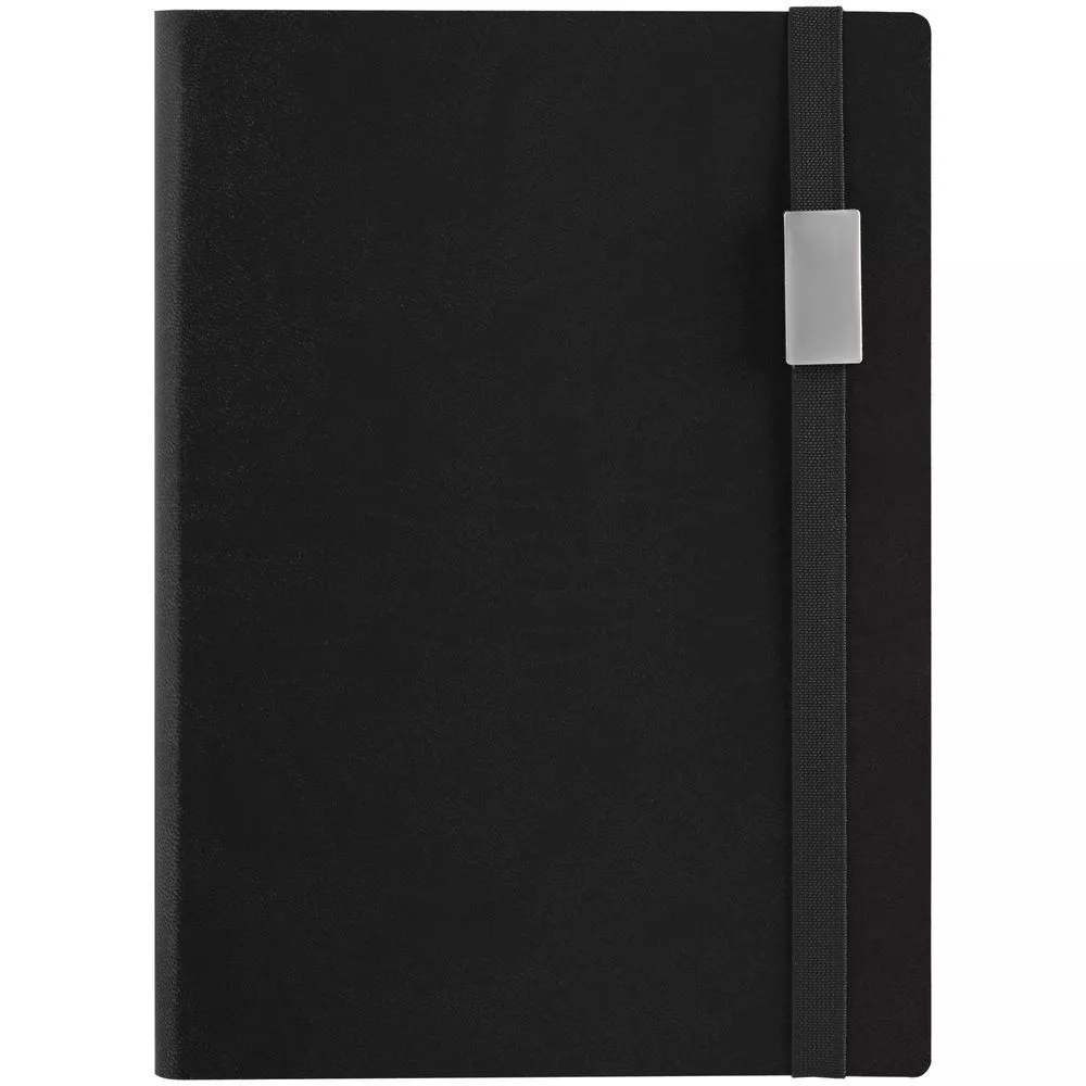 Ежедневник с гибкой обложкой выполнен из материала Latte, черный АА, и дополнен резинкой шириной 1 см с металлическим шильдом, капталом, ляссе черного цвета.