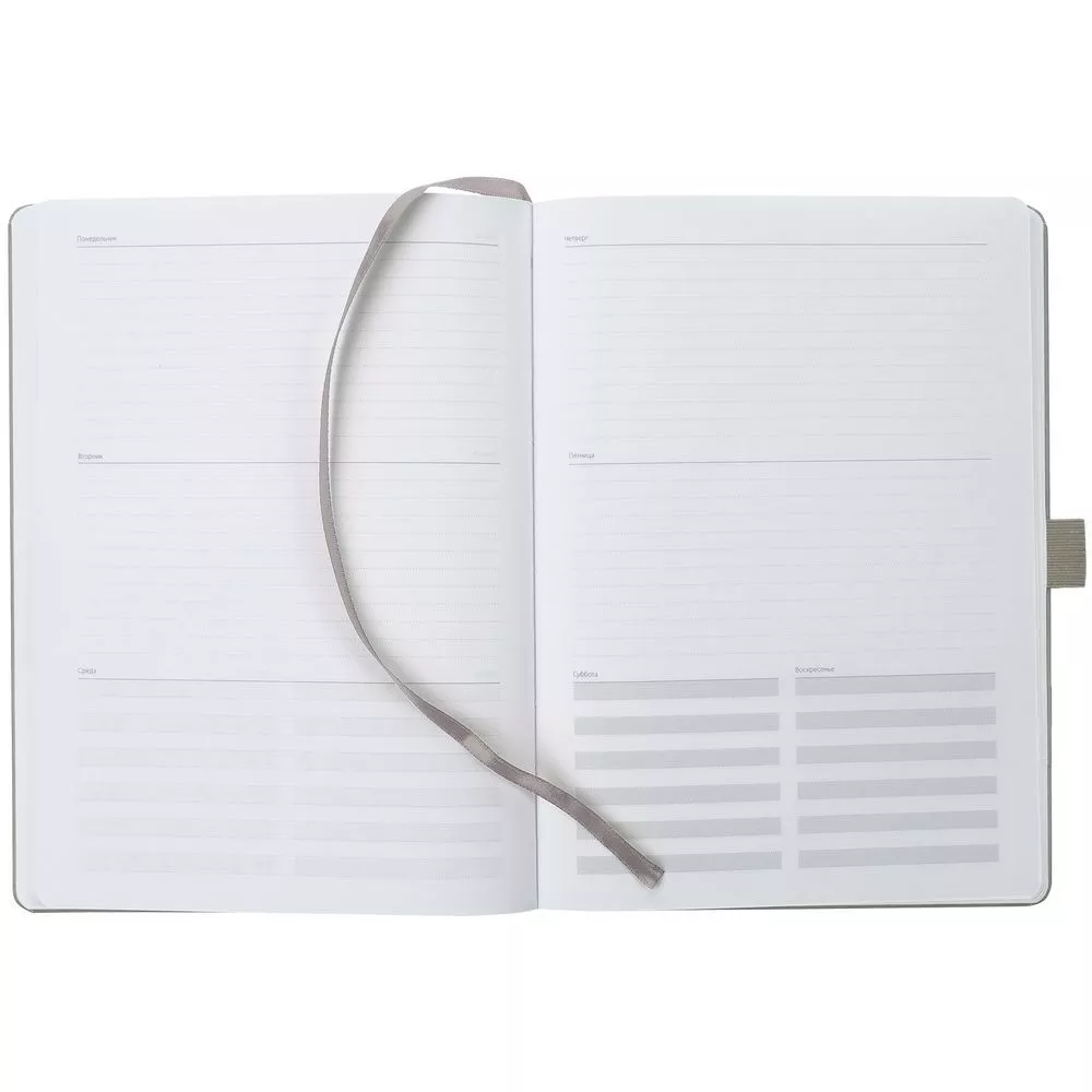 Еженедельник в твердой обложке выполнен из материала Brand, синий НН, дополнен резинкой, петлей для ручки и ляссе синего цвета.