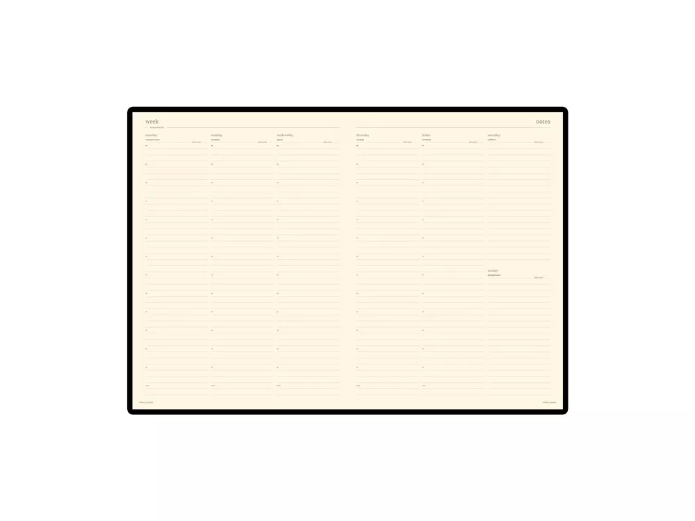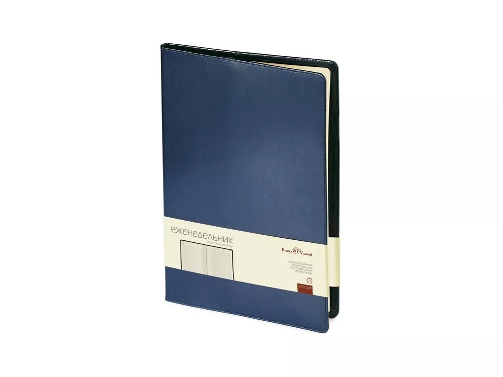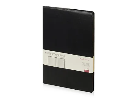 Строгий еженедельник портфолио выпускается в кожаной съемной обложке. По периметру обложки подходит строчка нитками в тон обложке. Металлизированный обрез блока окрашен под золото. Недатированный еженедельник формата А4 удобен для настольного использования. Блок для записей состоит из 128 страниц бежевой бумаги с плотностью 70 грамм. На 19 страницах размещен справочно-информационный блок с актуальными сведениями. Для размещения ручки предусмотрена кожаная петля.