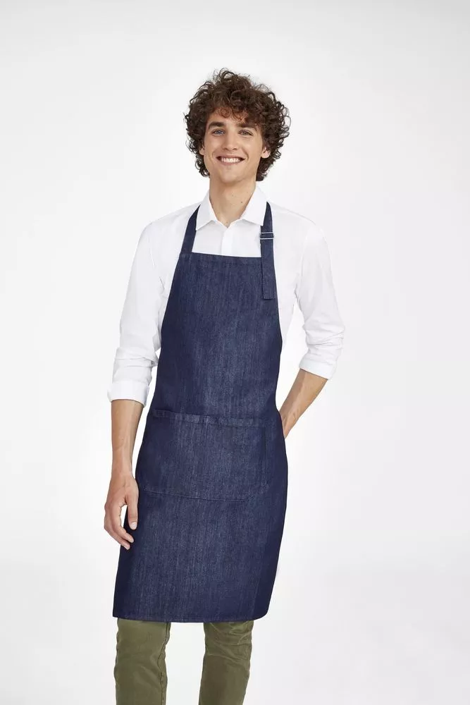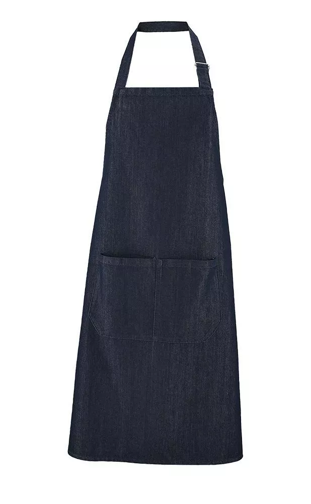 Стильный фартук из сырого денима с большими карманами спереди и регулируемой лямкой.