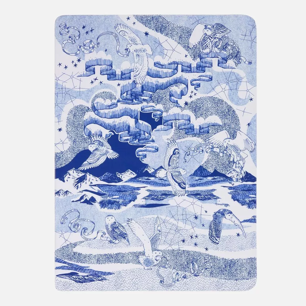Бескрайний простор Севера, горный пейзаж, созвездия и всполохи Северного сияния в окружении вереницы мудрых сов — настоящая магия происходит на пледе «Чудеса прилетели». Чудеса эти несут в себе отдельные смыслы: у совушек в клювах длинные листочки с пожеланиями и заветами на будущий год.