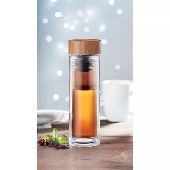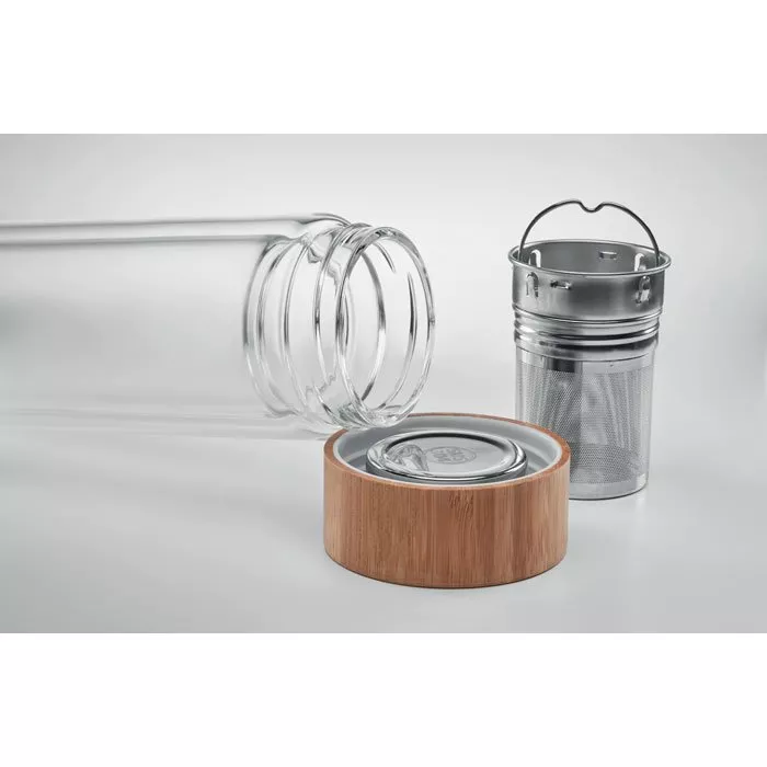 Бутылка из термостойкого стекла с бамбуковой крышкой с чайной сеточкой. Объем 420 мл.