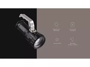 Мощный алюминиевый аккумуляторный фонарь с функцией Зум. Освещает равномерным ярким лучем с изменяемой шириной и дальностью. Содержит встроенное зарядное устройство для 3х аккумуляторов 18650. Световой поток: 800 люмен (максимум).Питание: аккумуляторы стандарта Li-ion 18650 (3 шт. в комплекте поставки). Контроль питания: цифровой импульсный контроллер. Мощность светодиода: 10Вт. Емкость батареи: 1500мАч (18650 li-ion), 3 шт. Время зарядки: 7 часов. Время работы: до 5 часов. Индекс цветопередачи: 80. Световой поток 270 лм. Цветовая температура: 9000 К. Дальность луча: 45 м
