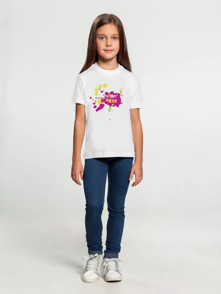 Классическая футболка с боковыми швами (4 года) или без боковых швов (с 6 лет), с укрепляющей тесьмой по вороту. Край ворота в резинку с эластаном. Двойная прострочка по низу, на рукавах и на вороте спереди.