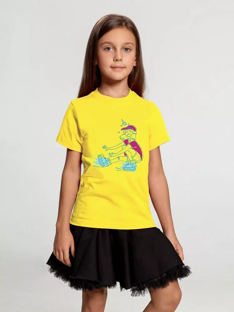 Кроеная детская футболка с круглым воротом-резинкой (рибана 1х1 с лайкрой). Высокое качество материалов: полотно джерси (кулирная гладь), прошедшее предварительную термоусадку; нить 30/1; особо гладкая гребенная пряжа. Активное крашение полотна.