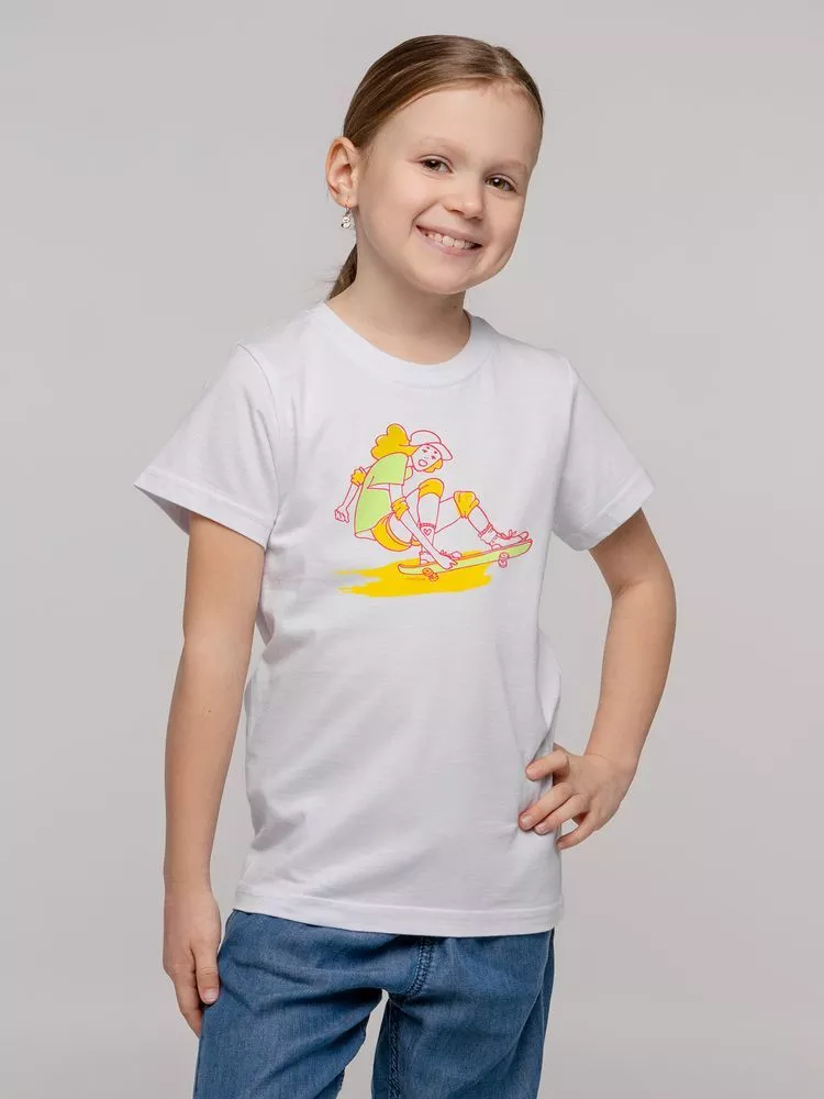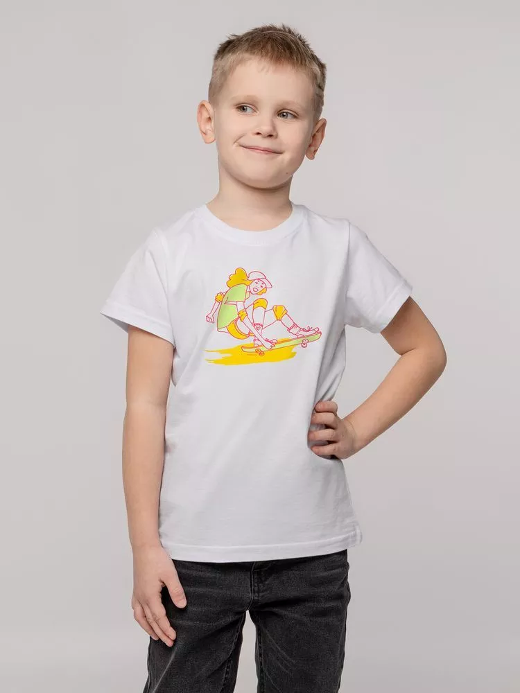 Кроеная детская футболка с круглым воротом-резинкой (рибана 1х1 с лайкрой). Высокое качество материалов: полотно джерси (кулирная гладь), прошедшее предварительную термоусадку; нить 30/1; особо гладкая гребенная пряжа. Активное крашение полотна.