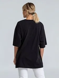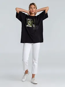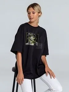 Футболка унисекс со спущенным плечом и круглым вырезом, отделанным резинкой.