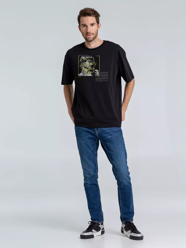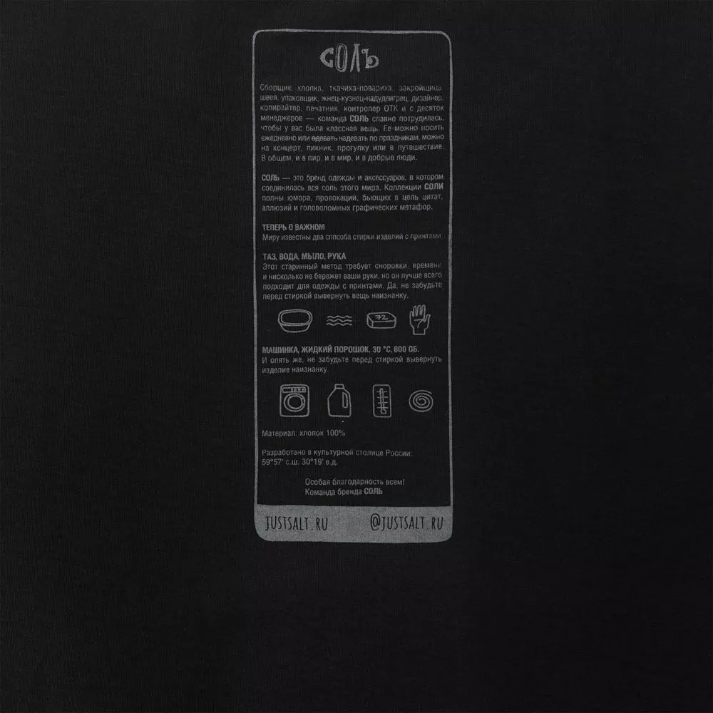 Принт с информацией о бренде и инструкцией по уходу за изделием на изнаночной стороне футболки.