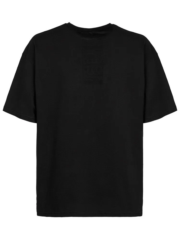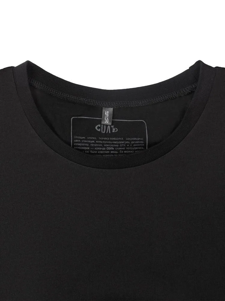 Принт с информацией о бренде и инструкцией по уходу за изделием на изнаночной стороне футболки.