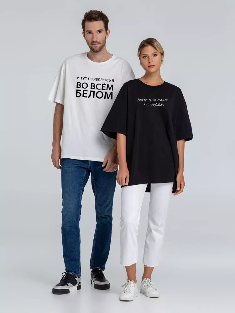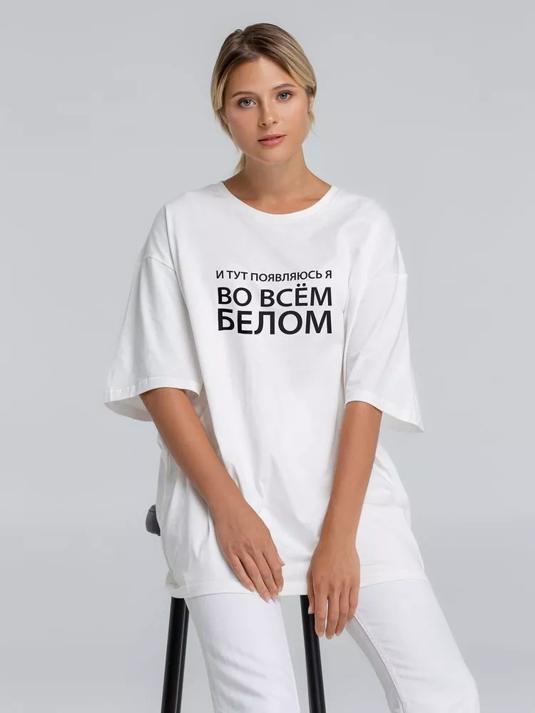 Креативная оверсайз футболка «Во всем белом» одновременно подчеркивает и чувство стиля, и чувство юмора. В этой футболке повышенное внимание к вашей персоне гарантированно.Футболка унисекс со спущенным плечом и круглым вырезом, отделанным резинкой.