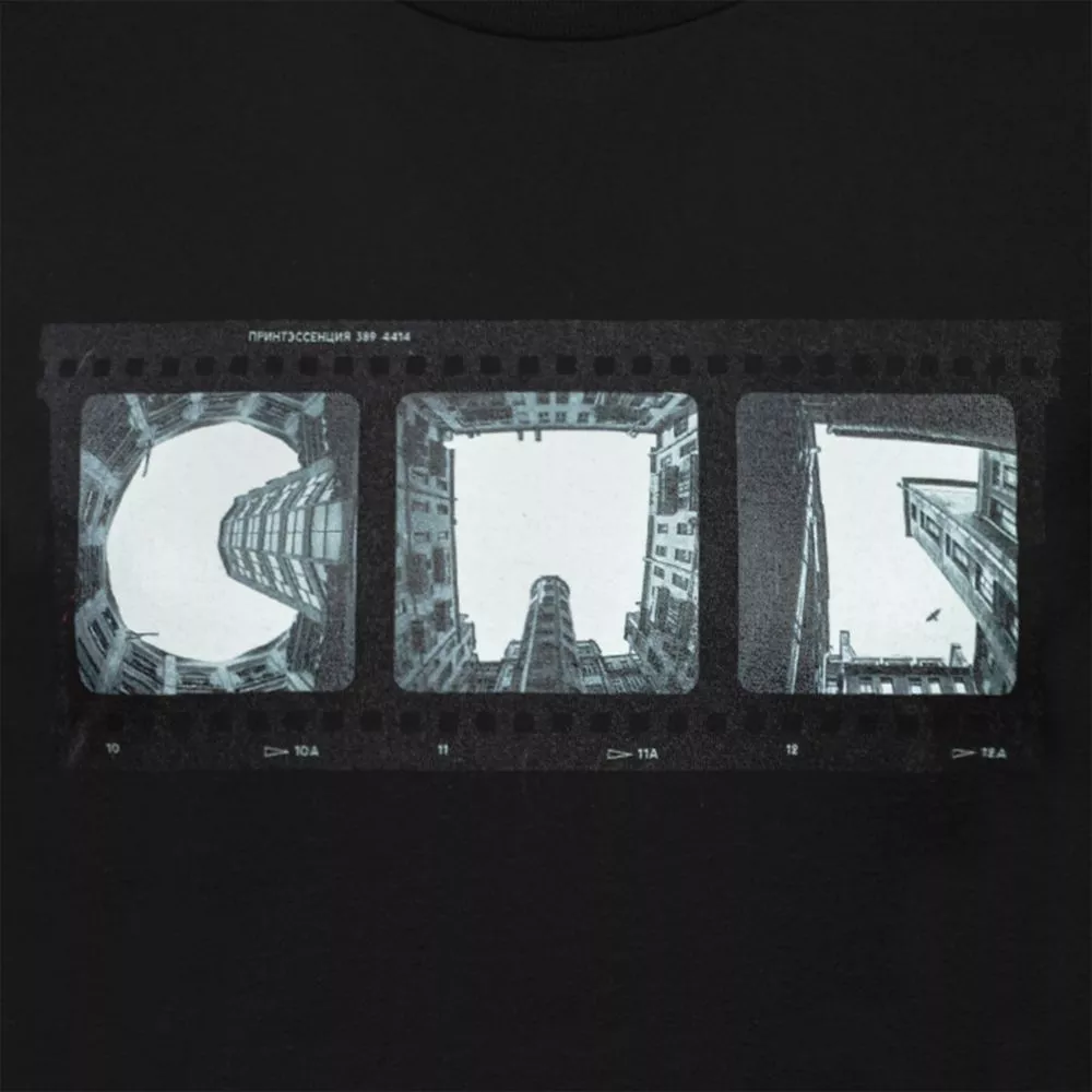 От фирменных питерских дворов-колодцев — а на принте очень четко обозначено место действия — кружится голова. От красоты, от неповторимости момента. Оттого, что здесь все возможно. Можно приподняться со дна «колодца» до самого неба. Стоит только поднять голову и открыться красоте.